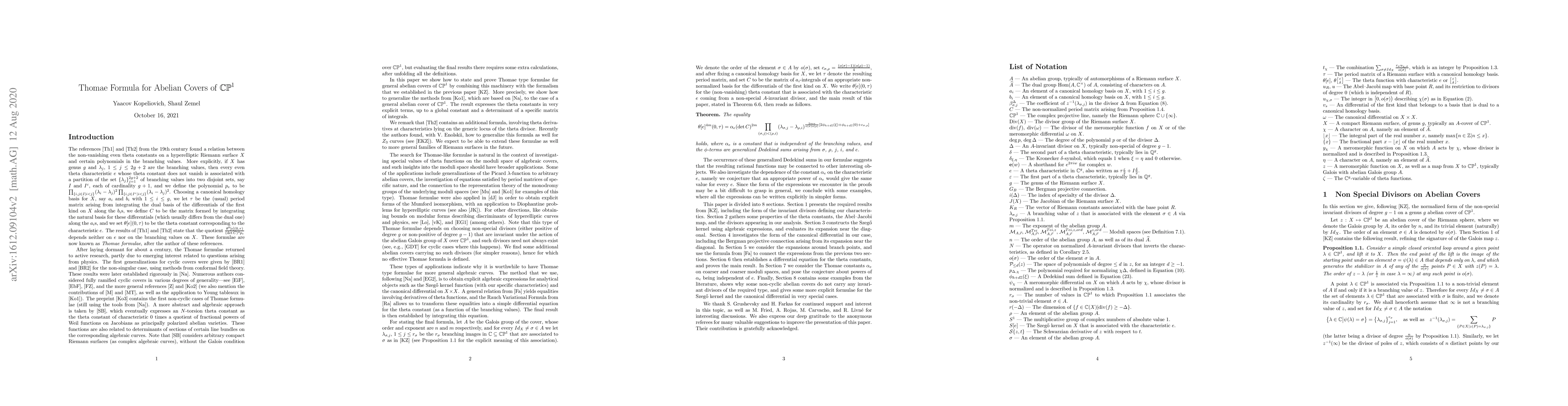 Abelian covers of $\mathbb{CP}^{1}$, with fixed Galois group $A$, are classified, as a first step, by a discrete set of parameters. Any such cover $X$, of genus $g\geq1$ say, carries a finite set of $A$-invariant divisors of degree $g-1$ on $X$ that produce non-zero theta constants on $X$. We show how to define a quotient involving a power of the theta constant on $X$ that is associated with such a divisor $\Delta$, some polynomial in the branching values, and a fixed determinant on $X$ that does not depend on $\Delta$, such that the quotient is constant on the moduli space of $A$-covers with the given discrete parameters. This generalizes the classical formula of Thomae, as well as all of its known extensions by various authors.