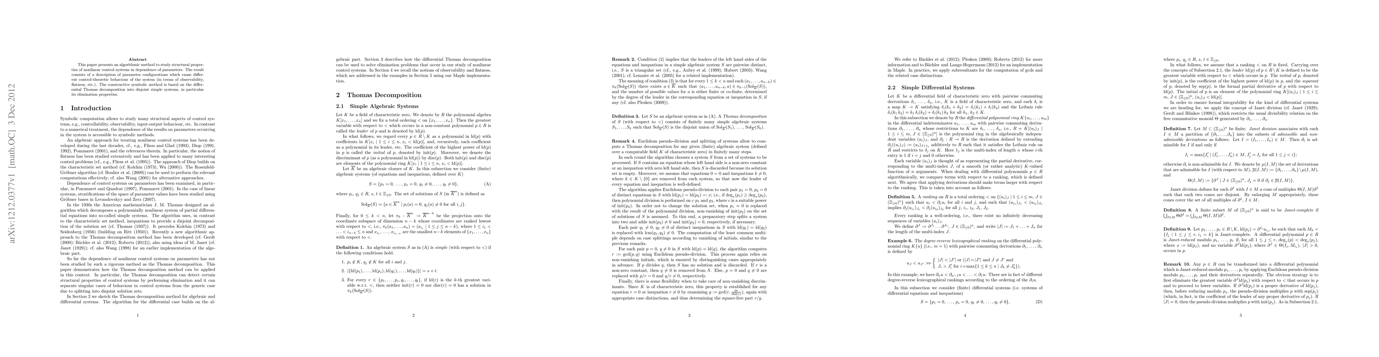 This paper presents an algorithmic method to study structural properties of nonlinear control systems in dependence of parameters. The result consists of a description of parameter configurations which cause different control-theoretic behaviour of the system (in terms of observability, flatness, etc.). The constructive symbolic method is based on the differential Thomas decomposition into disjoint simple systems, in particular its elimination properties.