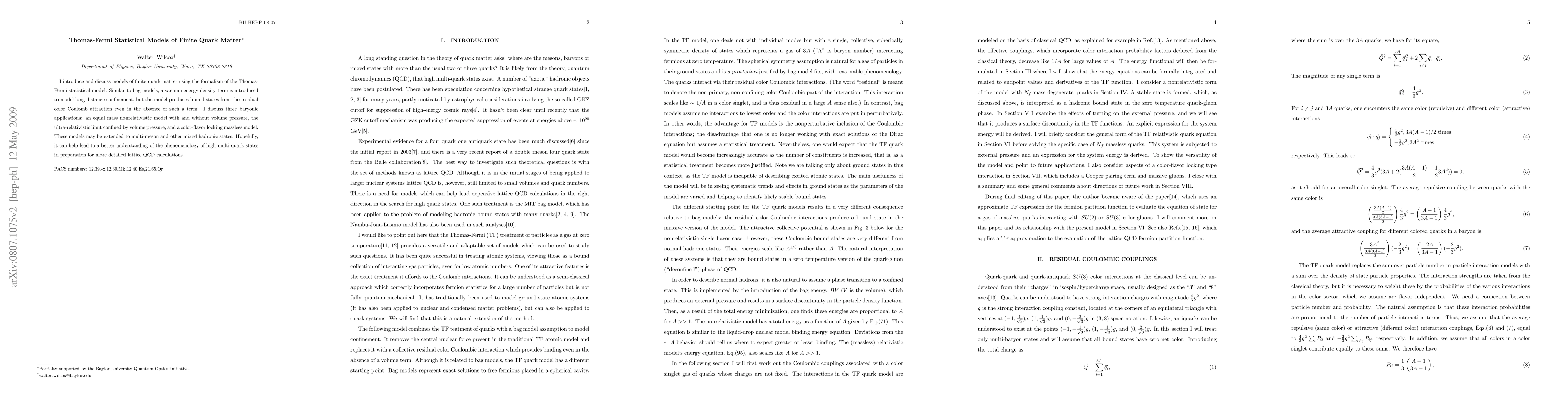 I introduce and discuss models of finite quark matter using the formalism of the Thomas-Fermi statistical model. Similar to bag models, a vacuum energy term is introduced to model long distance confinement, but the model produces bound states from the residual color Coulomb attraction even in the absence of such a term. I discuss three baryonic applications: an equal mass nonrelativistic model with and without volume pressure, the ultra-relativistic limit confined by volume pressure, and a color-flavor locking massless model. These model may be extended to multi-meson and other mixed hadronic states. Hopefully, it can help lead to a better understanding of the phenomenology of high multi-quark states in preparation for more detailed lattice QCD calculations.