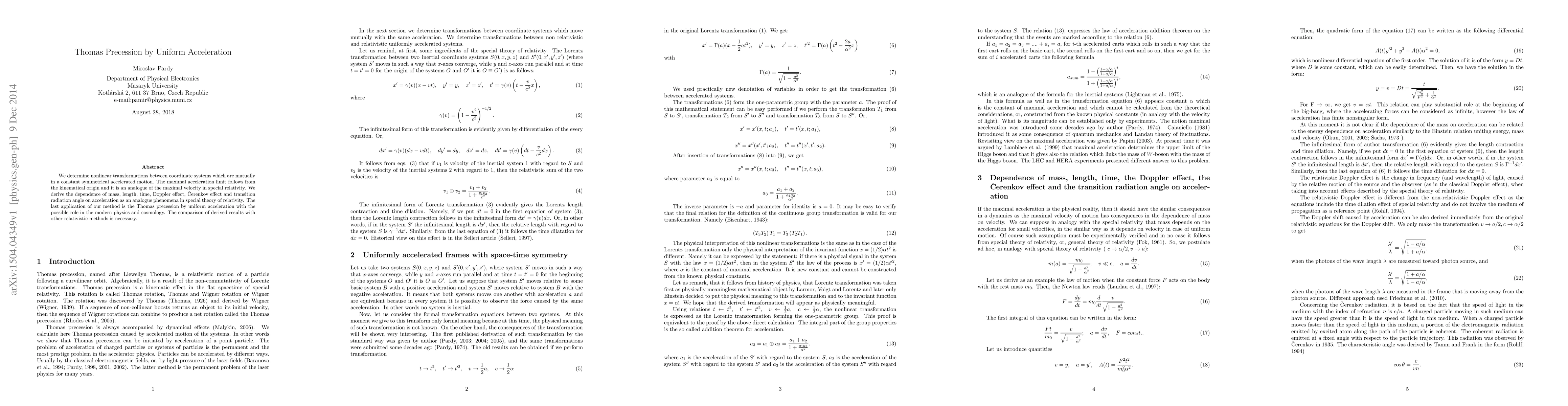 We determine the nonlinear transformations between coordinate systems which are mutually in a constant symmetrical accelerated motion. The maximal acceleration limit follows from the kinematical origin and it is an analogue of the maximal velocity in special relativity. We derive the dependence of mass, length, time, Doppler effect, Cherenkov effect and transition radiation angle on acceleration as an analogue phenomena in special theory of relativity. The last application of our method is the Thomas precession by uniform acceleration with the possible role in the modern physics and cosmology. The comparison of derived results with other relativistic methods is necessary.