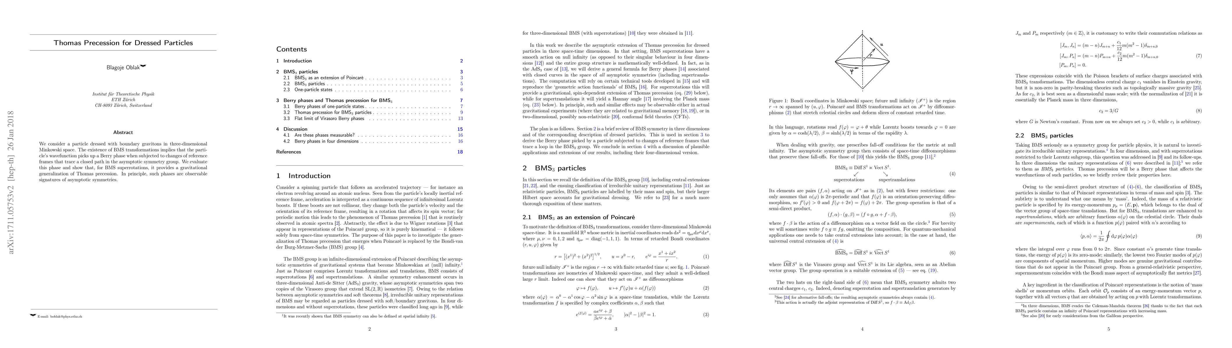We consider a particle dressed with boundary gravitons in three-dimensional Minkowski space. The existence of BMS transformations implies that the particle's wavefunction picks up a Berry phase when subjected to changes of reference frames that trace a closed path in the asymptotic symmetry group. We evaluate this phase and show that, for BMS superrotations, it provides a gravitational generalization of Thomas precession. In principle, such phases are observable signatures of asymptotic symmetries.
