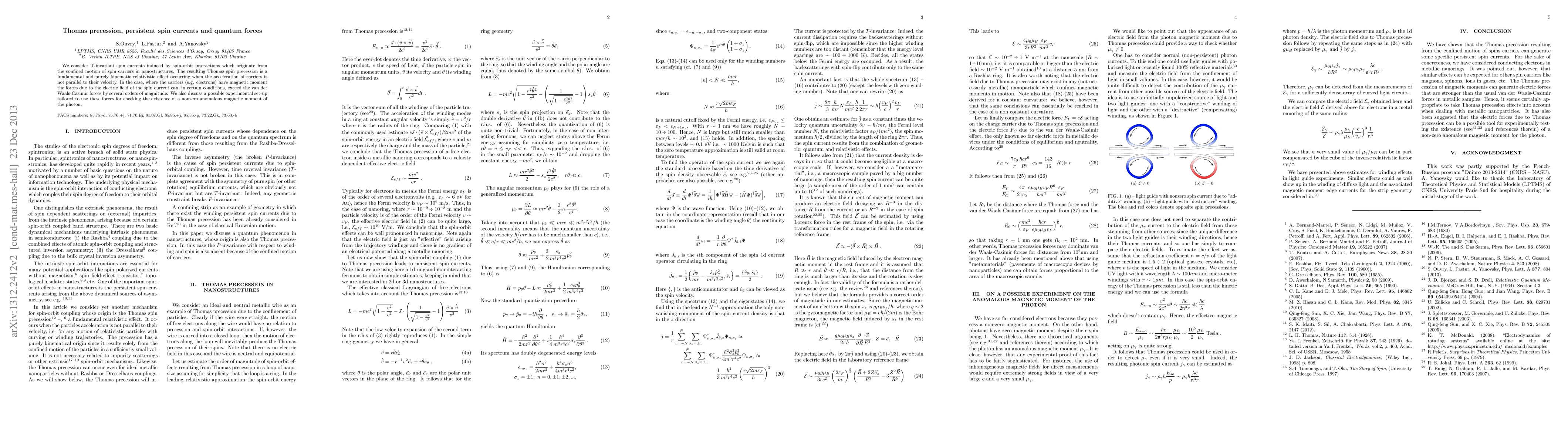 This paper investigates T-invariant spin currents in nanostructures due to spin-orbit interactions, leading to Thomas precession. It explores how these currents can generate forces that surpass van der Waals-Casimir forces under specific conditions, and proposes an experimental setup to verify the existence of a nonzero anomalous magnetic moment of the photon.