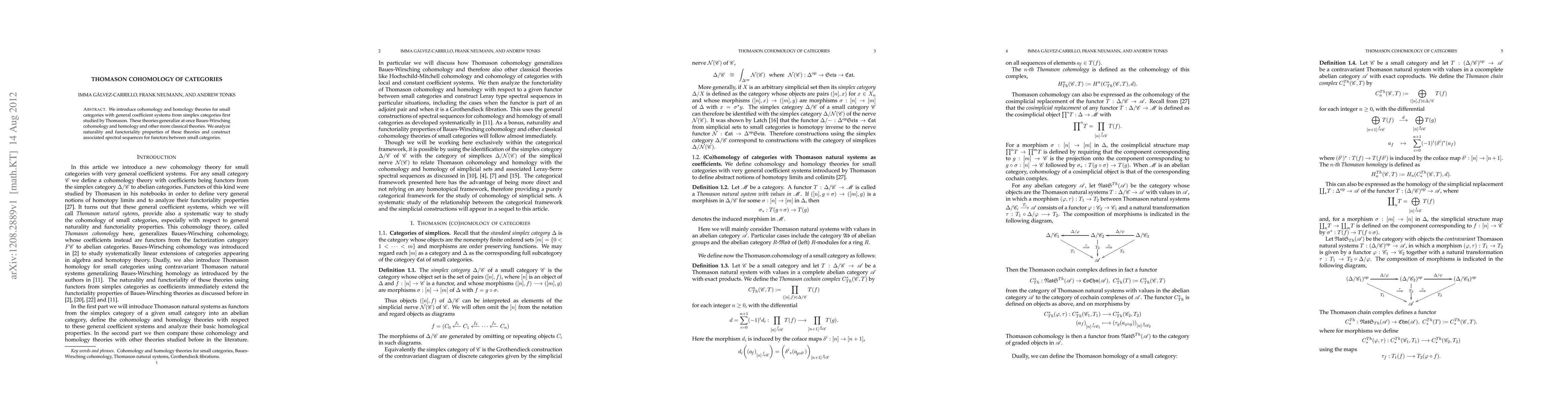 The paper introduces cohomology and homology theories for small categories using Thomason's simplex categories, generalizing existing Baues-Wirsching and classical theories, and discusses their naturality, functoriality, and spectral sequences for functors between categories.