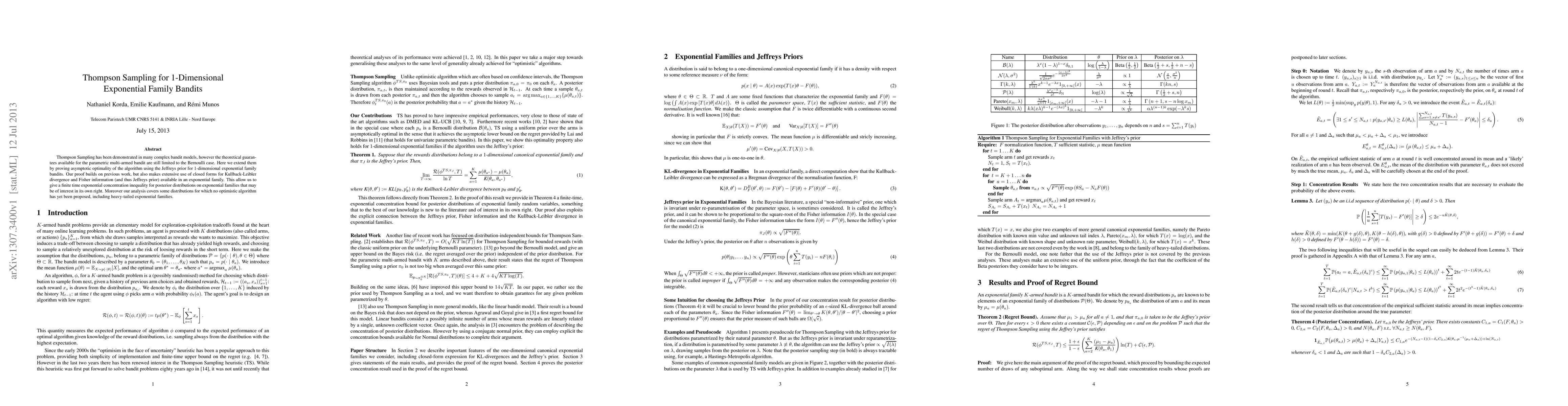 This paper extends Thompson Sampling to 1-dimensional exponential family bandits, proving its asymptotic optimality using the Jeffreys prior. The analysis provides a finite time exponential concentration inequality for posterior distributions, applicable to heavy-tailed distributions where no optimistic algorithm previously existed.