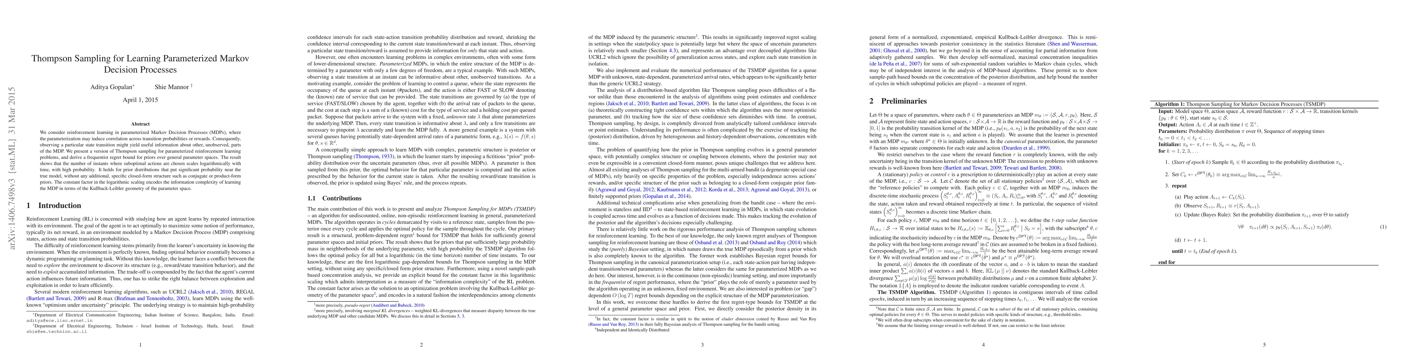 This paper proposes a Thompson sampling algorithm for parameterized Markov Decision Processes, demonstrating a logarithmic scaling of suboptimal action choices over time. The regret bound applies to general prior distributions, highlighting the information complexity of learning through the Kullback-Leibler geometry of the parameter space.