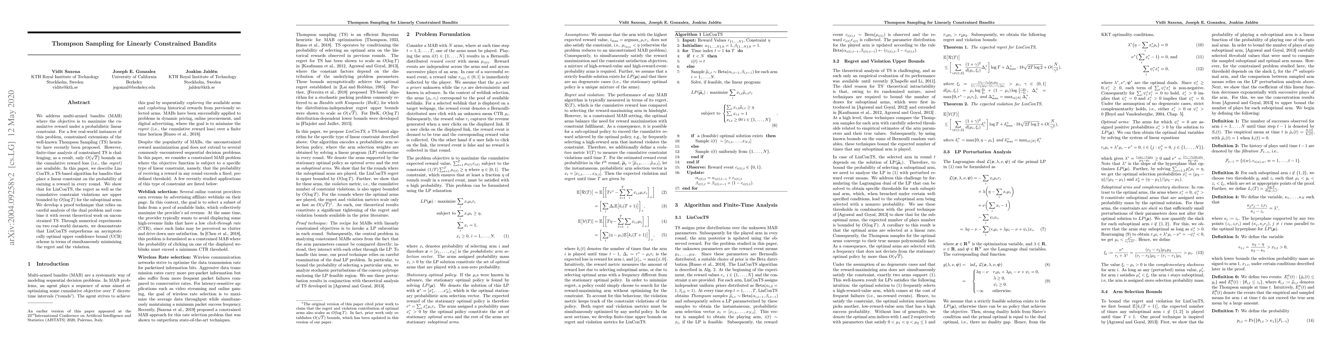 This paper introduces LinConTS, a Thompson Sampling-based algorithm for multi-armed bandits with linear constraints, achieving O(\log T) bounds on regret and constraint violations. Numerical experiments show LinConTS outperforms an optimal UCB scheme in minimizing both regret and constraint violations.