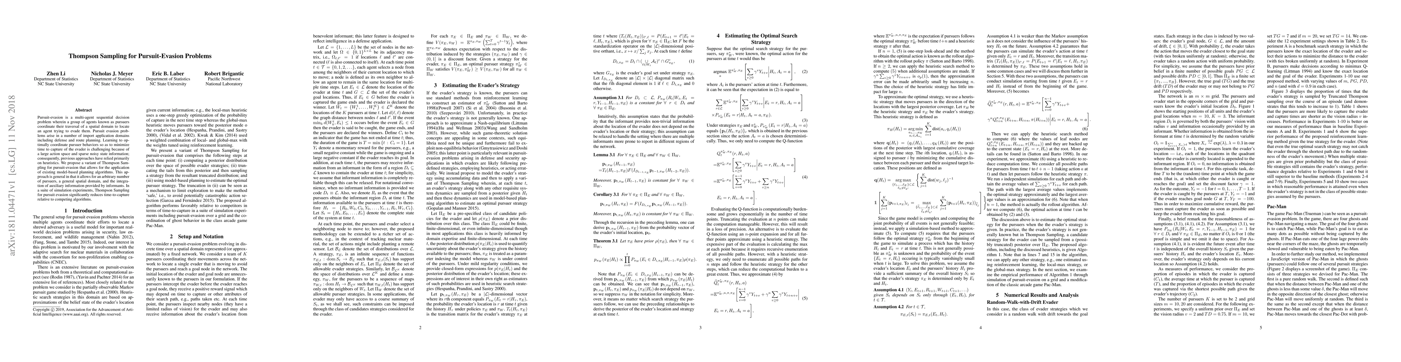 The paper proposes a Thompson Sampling variant for pursuit-evasion problems, integrating model-based planning algorithms for optimal coordination of pursuers to minimize time to capture of the evader, addressing challenges posed by large action spaces and sparse noisy state information.
