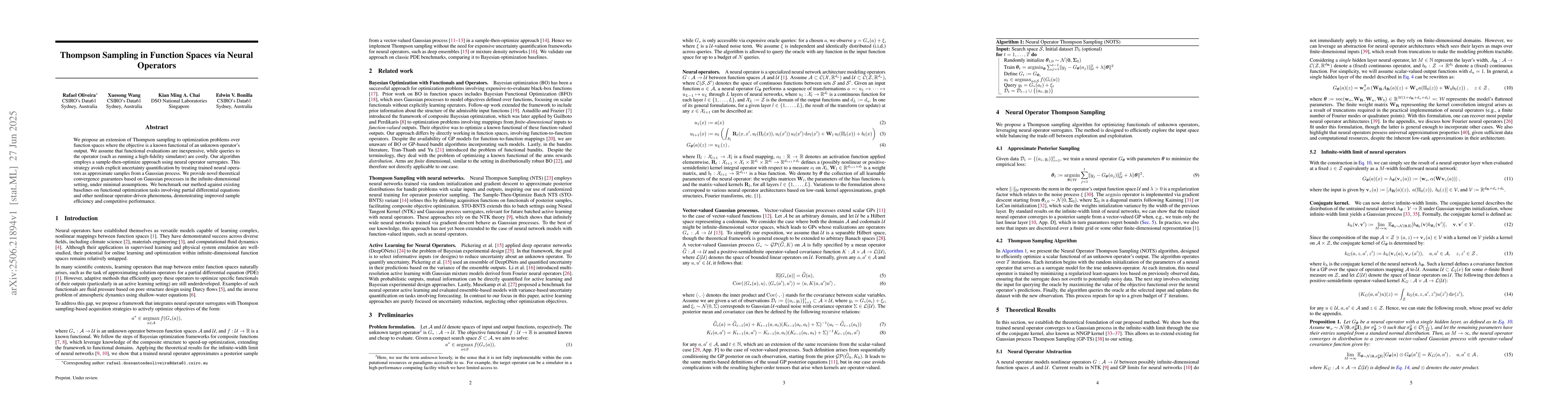 We propose an extension of Thompson sampling to optimization problems over function spaces where the objective is a known functional of an unknown operator's output. We assume that functional evaluations are inexpensive, while queries to the operator (such as running a high-fidelity simulator) are costly. Our algorithm employs a sample-then-optimize approach using neural operator surrogates. This strategy avoids explicit uncertainty quantification by treating trained neural operators as approximate samples from a Gaussian process. We provide novel theoretical convergence guarantees, based on Gaussian processes in the infinite-dimensional setting, under minimal assumptions. We benchmark our method against existing baselines on functional optimization tasks involving partial differential equations and other nonlinear operator-driven phenomena, demonstrating improved sample efficiency and competitive performance.