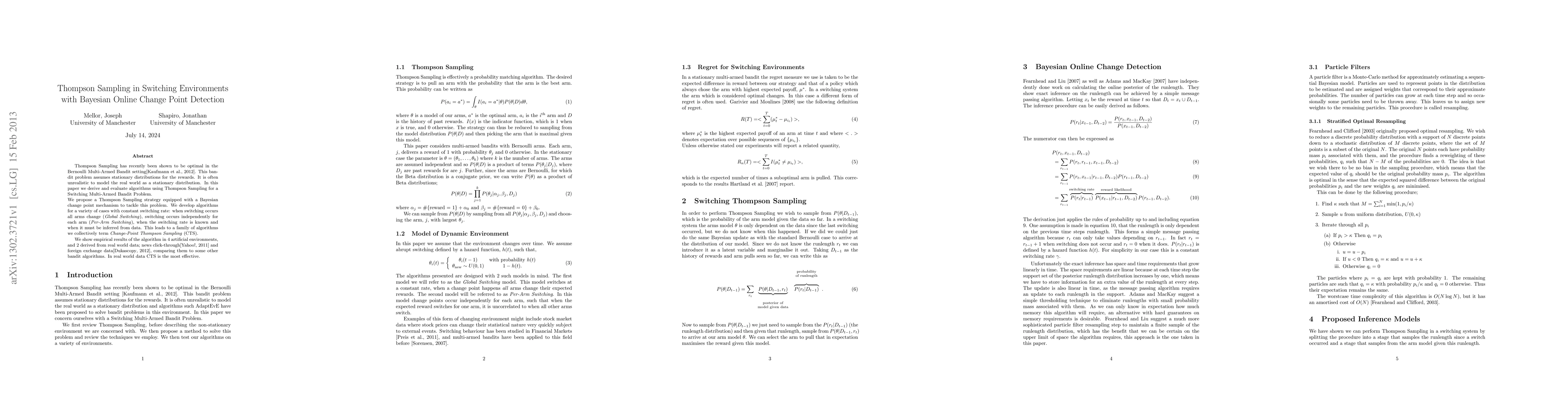 Thompson Sampling has recently been shown to be optimal in the Bernoulli Multi-Armed Bandit setting[Kaufmann et al., 2012]. This bandit problem assumes stationary distributions for the rewards. It is often unrealistic to model the real world as a stationary distribution. In this paper we derive and evaluate algorithms using Thompson Sampling for a Switching Multi-Armed Bandit Problem. We propose a Thompson Sampling strategy equipped with a Bayesian change point mechanism to tackle this problem. We develop algorithms for a variety of cases with constant switching rate: when switching occurs all arms change (Global Switching), switching occurs independently for each arm (Per-Arm Switching), when the switching rate is known and when it must be inferred from data. This leads to a family of algorithms we collectively term Change-Point Thompson Sampling (CTS). We show empirical results of the algorithm in 4 artificial environments, and 2 derived from real world data; news click-through[Yahoo!, 2011] and foreign exchange data[Dukascopy, 2012], comparing them to some other bandit algorithms. In real world data CTS is the most effective.