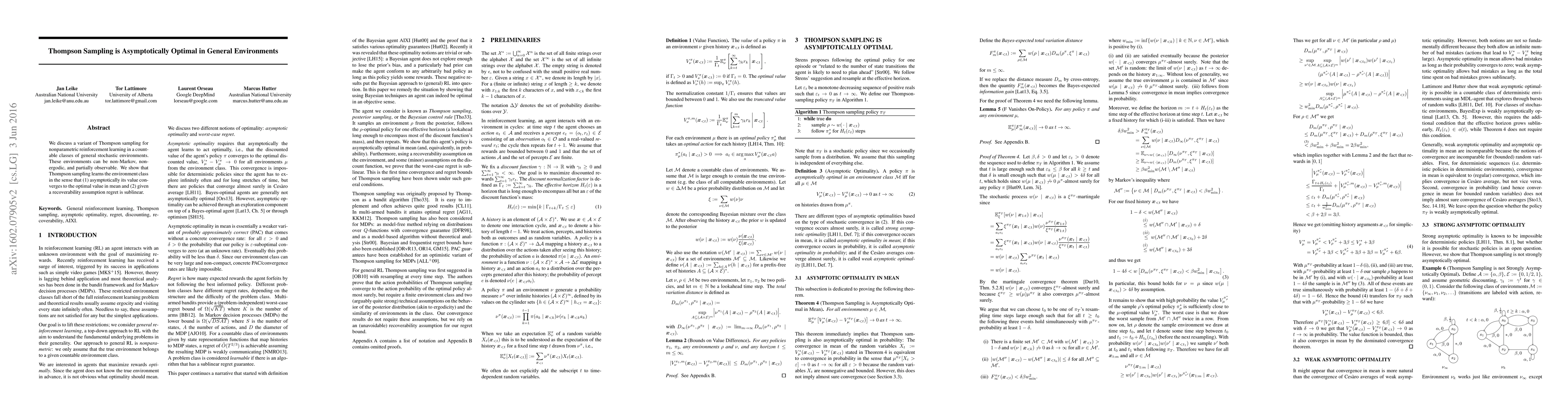 This paper demonstrates that a variant of Thompson sampling is asymptotically optimal for nonparametric reinforcement learning in general stochastic environments, which may be non-Markov, non-ergodic, and partially observable. It proves that the method converges to the optimal value and achieves sublinear regret under a recoverability assumption.