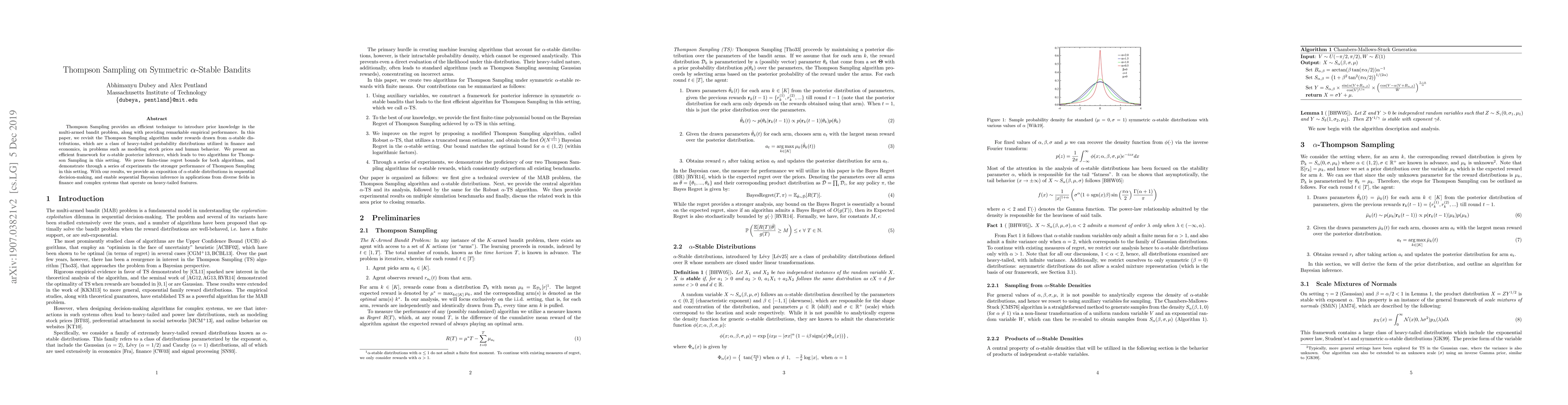 This paper revisits Thompson Sampling for multi-armed bandit problems with rewards from heavy-tailed symmetric u03c1-stable distributions, common in finance and economics. It presents efficient posterior inference frameworks, proves regret bounds for two resulting algorithms, and demonstrates Thompson Sampling's superior performance via experiments, enabling sequential Bayesian inference in diverse fields dealing with heavy-tailed features.
