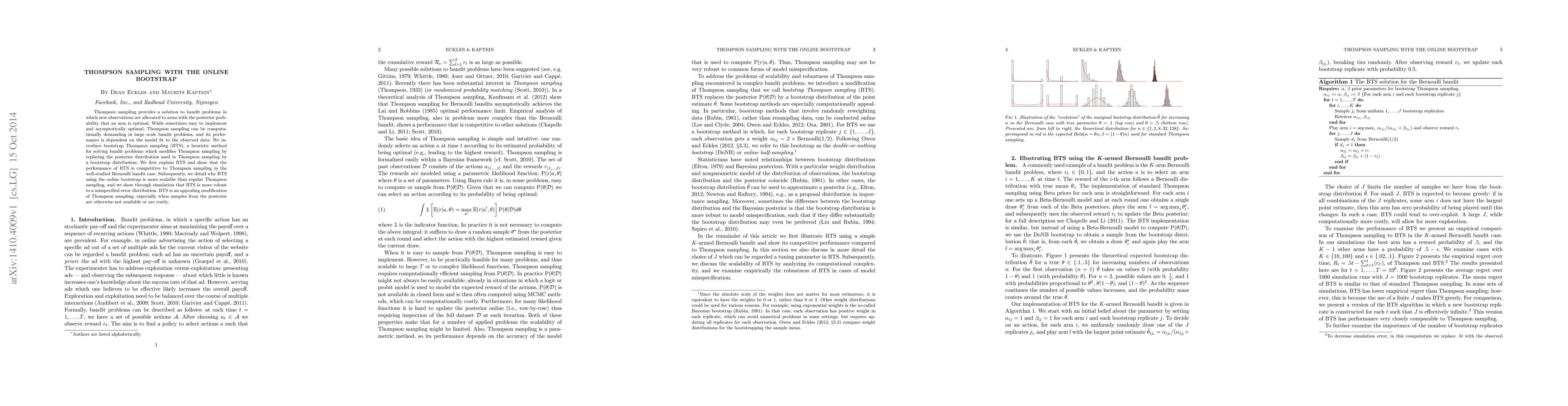 Thompson sampling with the online bootstrap (BTS) addresses the scalability and computational demands of traditional Thompson sampling in large-scale bandit problems by replacing the posterior distribution with a bootstrap distribution, demonstrating competitive performance and robustness to misspecifications. BTS using the online bootstrap method is more scalable and practical for scenarios where generating posterior samples is costly.