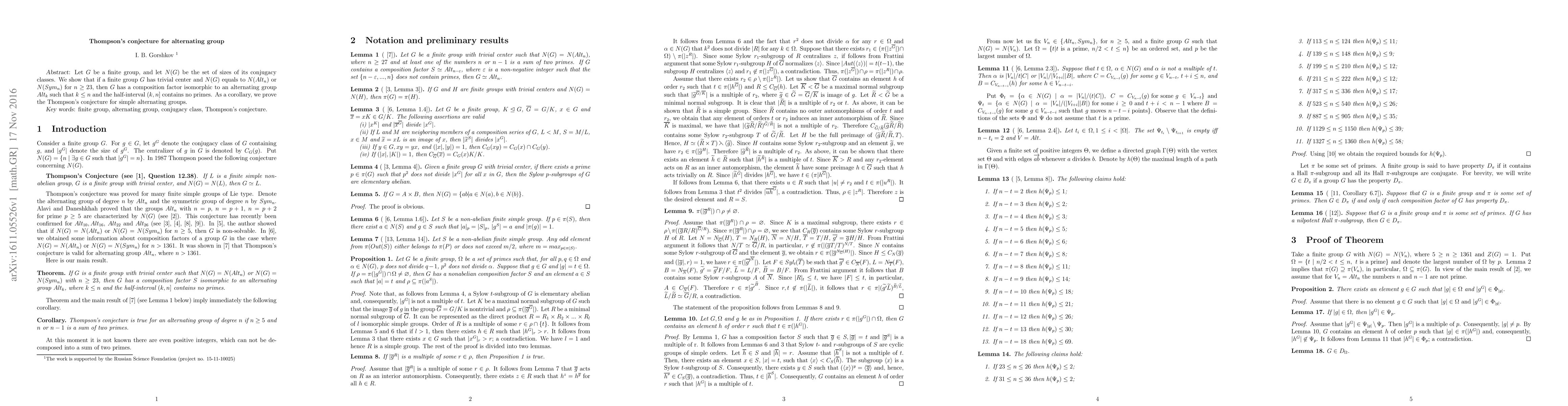 Let $G$ be a finite group, and let $N(G)$ be the set of sizes of its conjugacy classes. We show that if a finite group $G$ has trivial center and $N(G)$ equals to $N(Alt_n)$ or $N(Sym_n)$ for $n\geq 23$, then $G$ has a composition factor isomorphic to an alternating group $Alt_k$ such that $k\leq n$ and the half-interval $(k, n]$ contains no primes. As a corollary, we prove the Thompson's conjecture for simple alternating groups.