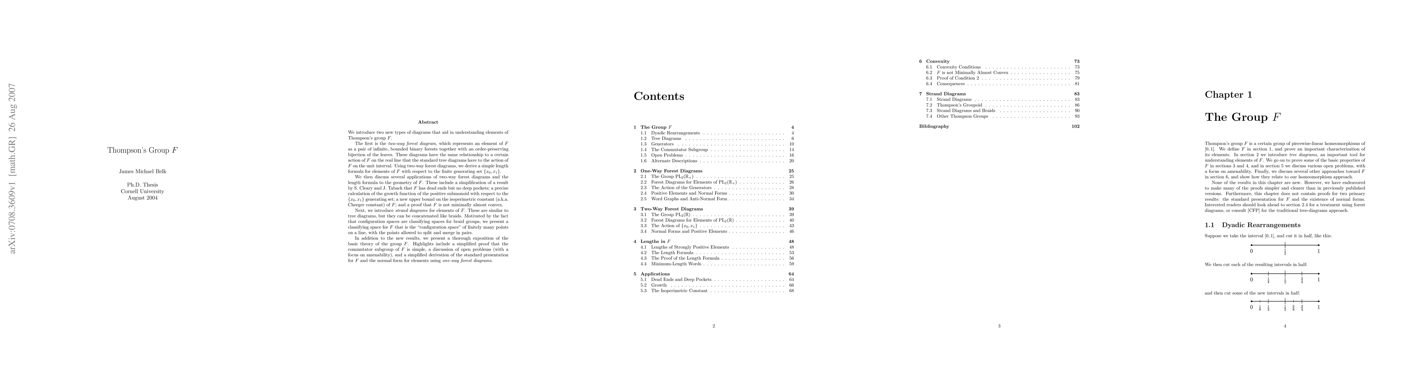 This paper introduces forest and strand diagrams for Thompson's group F, providing a new length formula and upper bound on its isoperimetric constant. It also presents a classifying space for F and derives new presentations for F, T, V, and BV, alongside a simplified proof of the simplicity of F's commutator subgroup.
