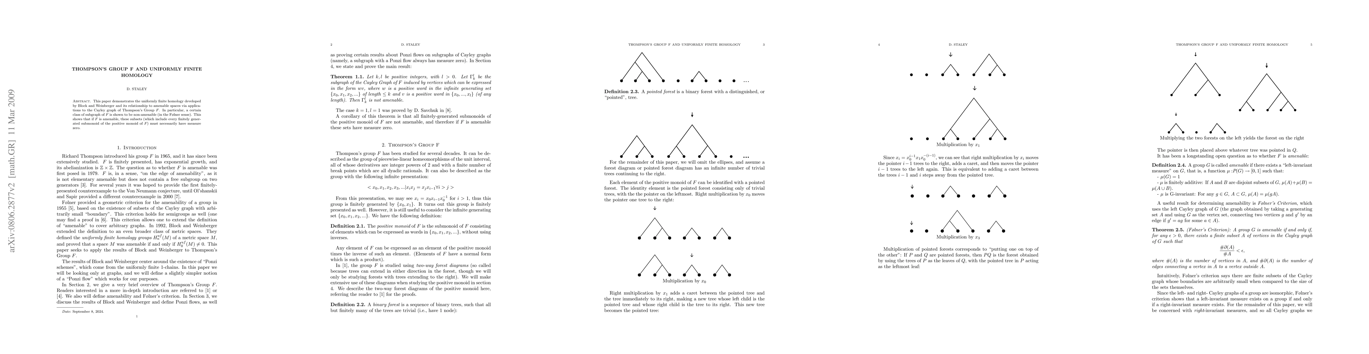 This paper explores uniformly finite homology in relation to amenable spaces, applying it to Thompson's Group F's Cayley graph and demonstrating that a specific class of subgraphs within F is non-amenable, implying that if F is amenable, these subsets must have measure zero.