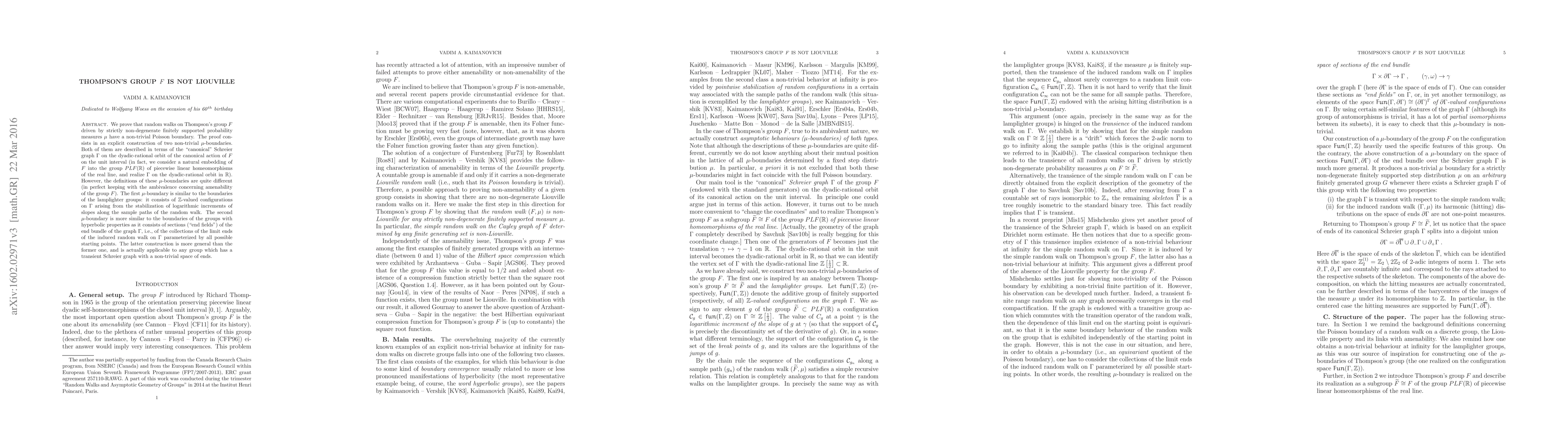 This paper proves that Thompson's group $F$ is not Liouville by demonstrating that random walks on $F$ driven by non-degenerate measures have non-trivial Poisson boundaries. It constructs two distinct non-trivial $\mu$-boundaries, illustrating different behaviors at infinity reflective of $F$'s ambiguous amenability.