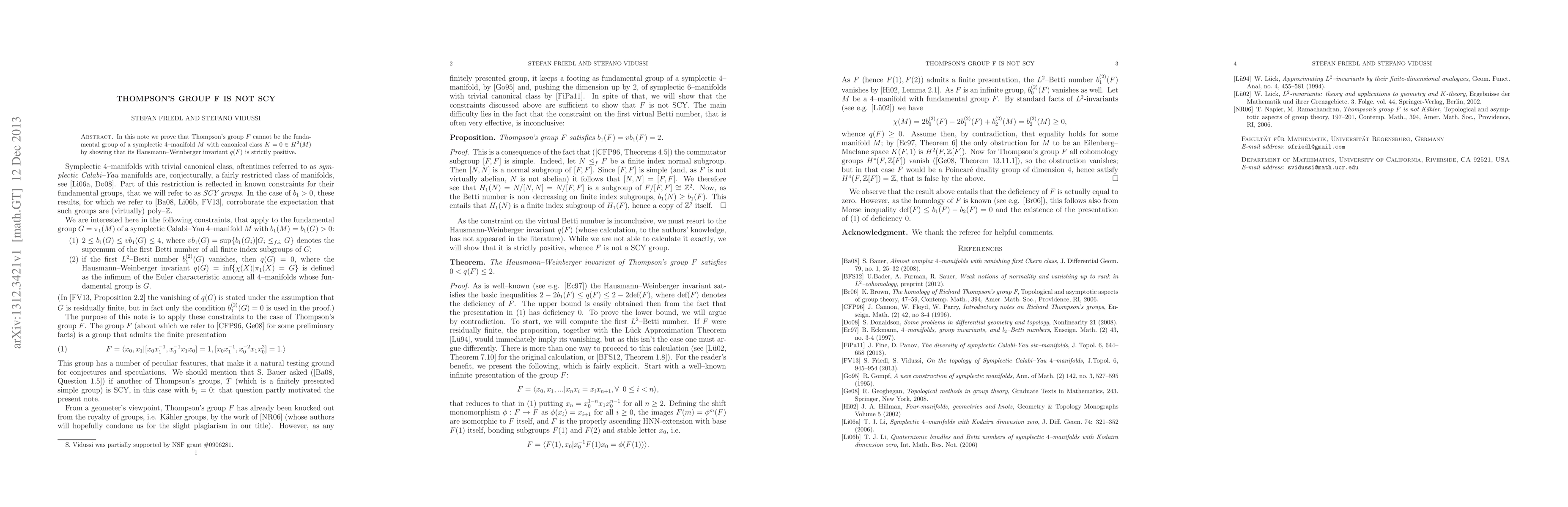 Summary: This paper demonstrates that Thompson's group F cannot serve as the fundamental group of a symplectic 4-manifold with a trivial canonical class, as its Hausmann-Weinberger invariant q(F) is shown to be strictly positive.