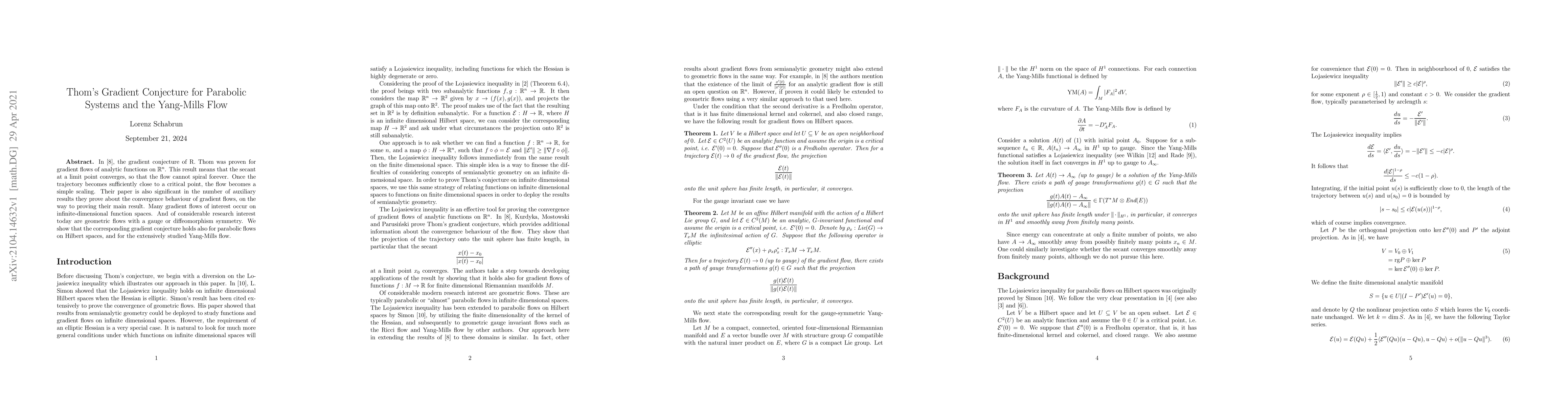 This paper proves Thom's gradient conjecture for parabolic flows on Hilbert spaces, extending the result to include the Yang-Mills flow, which demonstrates that trajectories cannot spiral indefinitely and will eventually converge to a critical point. The authors also provide auxiliary results on the convergence behavior of gradient flows.
