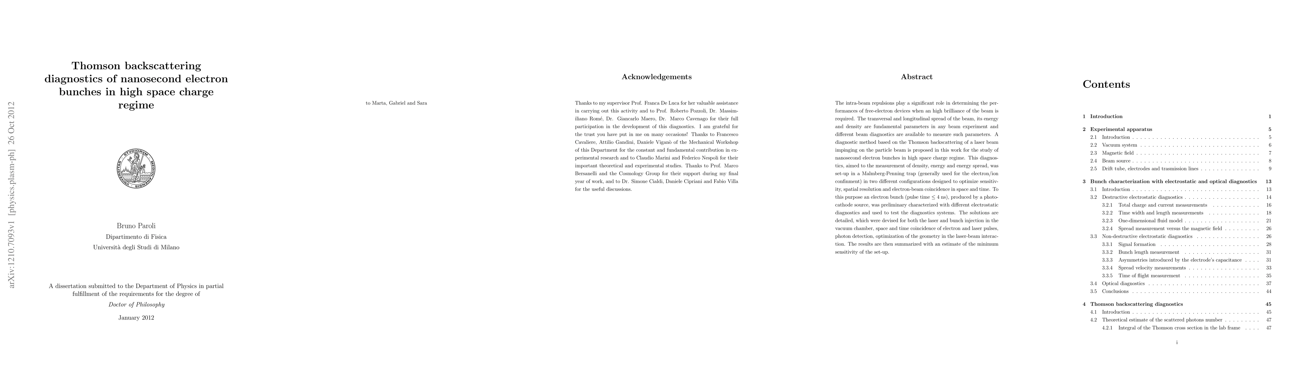The intra-beam repulsions play a significant role in determining the performances of free-electron devices when an high brilliance of the beam is required. The transversal and longitudinal spread of the beam, its energy and density are fundamental parameters in any beam experiment and different beam diagnostics are available to measure such parameters. A diagnostic method based on the Thomson backscattering of a laser beam impinging on the particle beam is proposed in this work for the study of nanosecond electron bunches in high space charge regime. This diagnostics, aimed to the measurement of density, energy and energy spread, was set-up in a Malmberg-Penning trap (generally used for the electron/ion confinment) in two different configurations designed to optimize sensitivity, spatial resolution and electron-beam coincidence in space and time. To this purpose an electron bunch (pulse time <4ns), produced by a photocathode source, was preliminary characterized with different electrostatic diagnostics and used to test the diagnostics systems. The solutions are detailed, which were devised for both the laser and bunch injection in the vacuum chamber, space and time coincidence of electron and laser pulses, photon detection, optimization of the geometry in the laser-beam interaction. The results are then summarized with an estimate of the minimum sensitivity of the set-up.