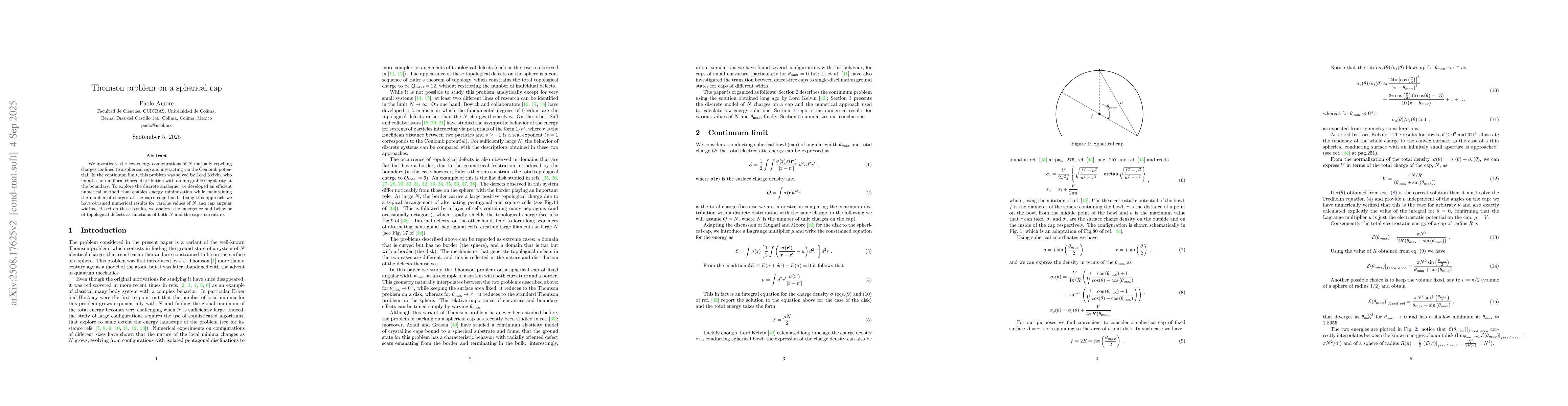 We investigate the low-energy configurations of N mutually repelling charges confined to a spherical cap and interacting via the Coulomb potential. In the continuum limit, this problem was solved by Lord Kelvin, who found a non-uniform charge distribution with an integrable singularity at the boundary. To explore the discrete analogue, we developed an efficient numerical method that enables energy minimization while maintaining the number of charges at the cap's edge fixed. Using this approach we have obtained numerical results for various values of N and cap angular widths. Based on these results, we analyze the emergence and behavior of topological defects as functions of both N and the cap's curvature.