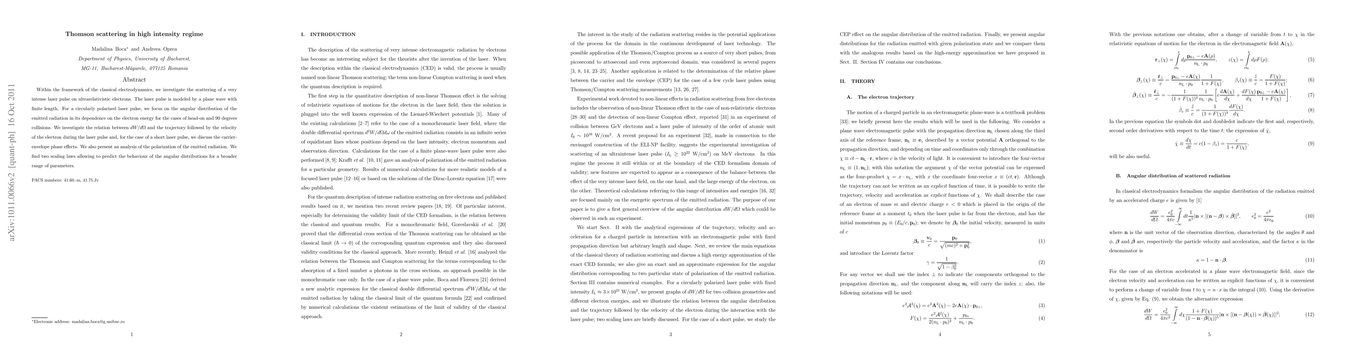 This paper explores Thomson scattering of extremely intense laser pulses by relativistic electrons, modeling the laser as a finite, circularly polarized plane wave. Key findings include angular distribution analysis of emitted radiation ($dW/dOmega$) for varying electron energies and collision geometries. The study investigates the impact of laser pulse length and carrier-envelope phase on scattering, and compares classical formula predictions with high-energy approximations for polarization of emitted radiation.