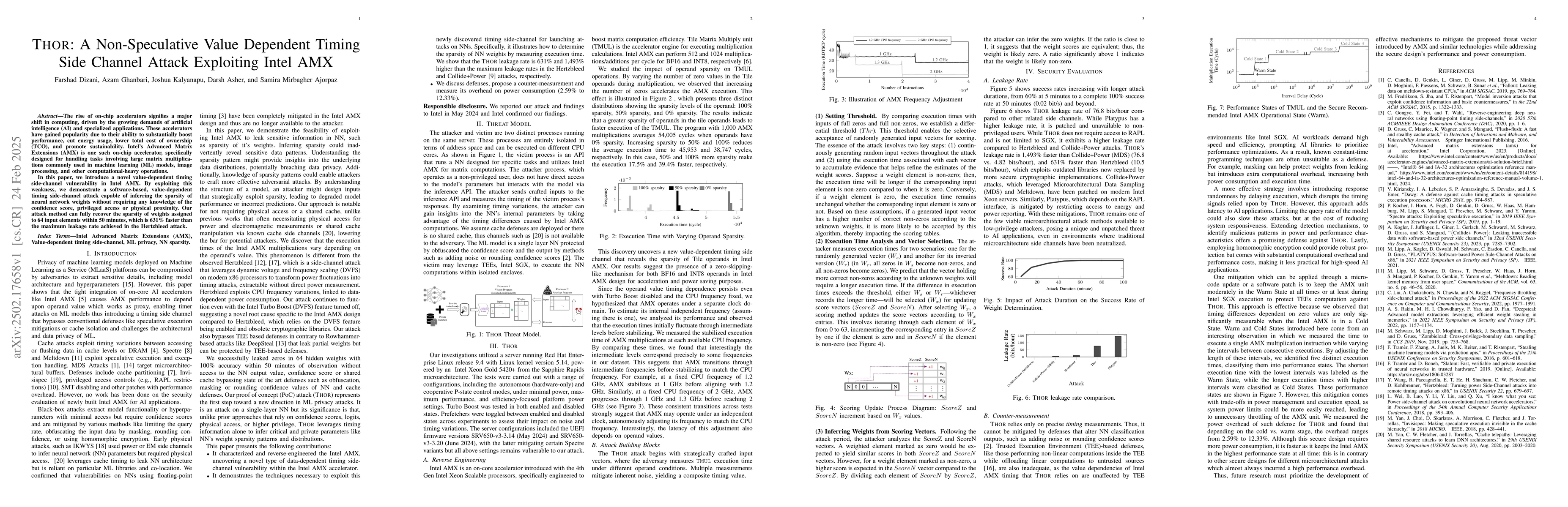The research employs reverse engineering and timing analysis of Intel AMX to uncover a value-dependent timing side-channel vulnerability. The attack, named THOR, uses strategically crafted input vectors to measure TMUL execution times and infer neural network weight sparsity patterns.