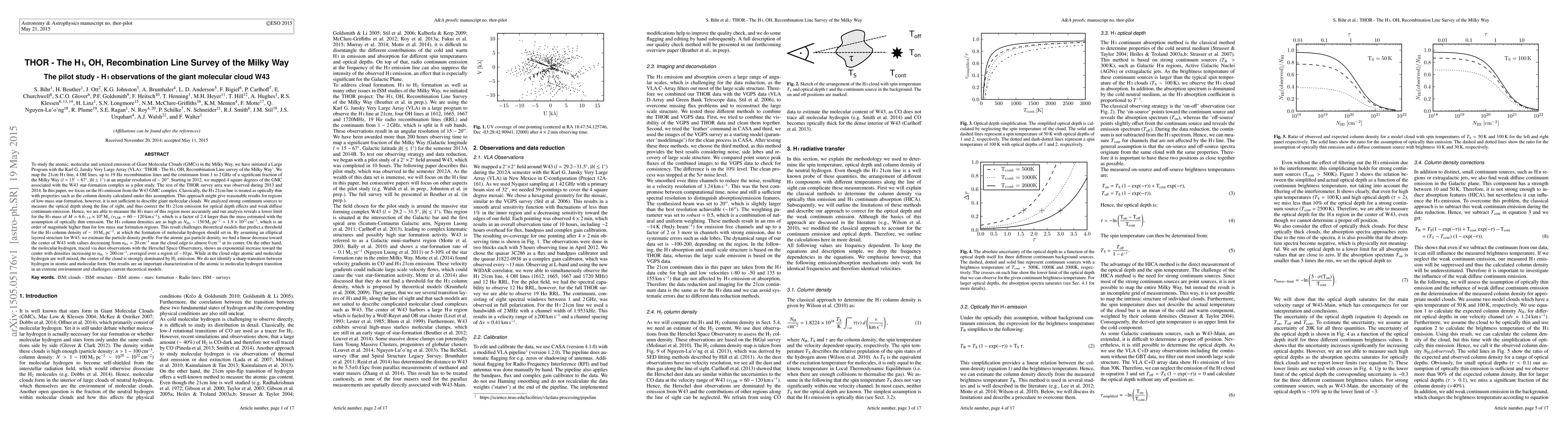 To study the atomic, molecular and ionized emission of Giant Molecular Clouds (GMCs), we have initiated a Large Program with the VLA: 'THOR - The HI, OH, Recombination Line survey of the Milky Way'. We map the 21cm HI line, 4 OH lines, 19 H_alpha recombination lines and the continuum from 1 to 2 GHz of a significant fraction of the Milky Way (l=15-67deg, |b|<1deg) at ~20" resolution. In this paper, we focus on the HI emission from the W43 star-formation complex. Classically, the HI 21cm line is treated as optically thin with column densities calculated under this assumption. This might give reasonable results for regions of low-mass star-formation, however, it is not sufficient to describe GMCs. We analyzed strong continuum sources to measure the optical depth, and thus correct the HI 21cm emission for optical depth effects and weak diffuse continuum emission. Hence, we are able to measure the HI mass of W43 more accurately and our analysis reveals a lower limit of M=6.6x10^6 M_sun, which is a factor of 2.4 larger than the mass estimated with the assumption of optically thin emission. The HI column densities are as high as N(HI)~150 M_sun/pc^2 ~ 1.9x10^22 cm^-2, which is an order of magnitude higher than for low mass star formation regions. This result challenges theoretical models that predict a threshold for the HI column density of ~10 M_sun/pc^2, at which the formation of molecular hydrogen should set in. By assuming an elliptical layered structure for W43, we estimate the particle density profiles. While at the cloud edge atomic and molecular hydrogen are well mixed, the center of the cloud is strongly dominated by molecular hydrogen. We do not identify a sharp transition between hydrogen in atomic and molecular form. Our results are an important characterization of the atomic to molecular hydrogen transition in an extreme environment and challenges current theoretical models.