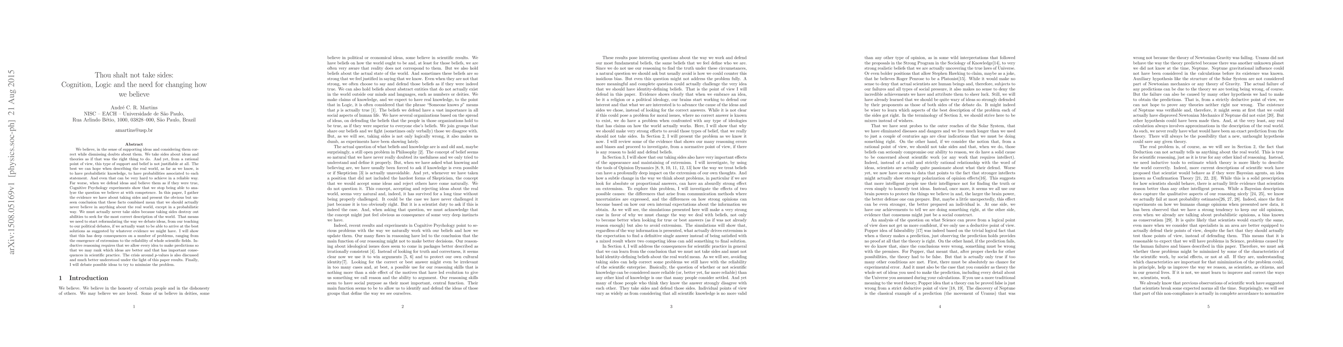 We believe, in the sense of supporting ideas and considering them correct while dismissing doubts about them. We take sides about ideas and theories as if that was the right thing to do. And yet, from a rational point of view, this type of support and belief is not justifiable at all. The best we can hope when describing the real world, as far as we know, is to have probabilistic knowledge, to have probabilities associated to each statement. And even that can be very hard to achieve in a reliable way. Far worse, when we defend ideas and believe them as if they were true, Cognitive Psychology experiments show that we stop being able to analyze the question we believe at with competence. In this paper, I gather the evidence we have about taking sides and present the obvious but unseen conclusion that these facts combined mean that we should actually never believe in anything about the real world, except in a probabilistic way. We must actually never take sides because taking sides destroy out abilities to seek for the most correct description of the world. That means we need to start reformulating the way we debate ideas, from our teaching to our political debates, if we actually want to be able to arrive at the best solutions as suggested by whatever evidence we might have. I will show that this has deep consequences on a number of problems, ranging from the emergence of extremism to the reliability of whole scientific fields. Inductive reasoning requires that we allow every idea to make predictions so that we may rank which ideas are better and that has important consequences in scientific practice. The crisis around $p$-values is also discussed and much better understood under the light of this paper results. Finally, I will debate possible ideas to try to minimize the problem.