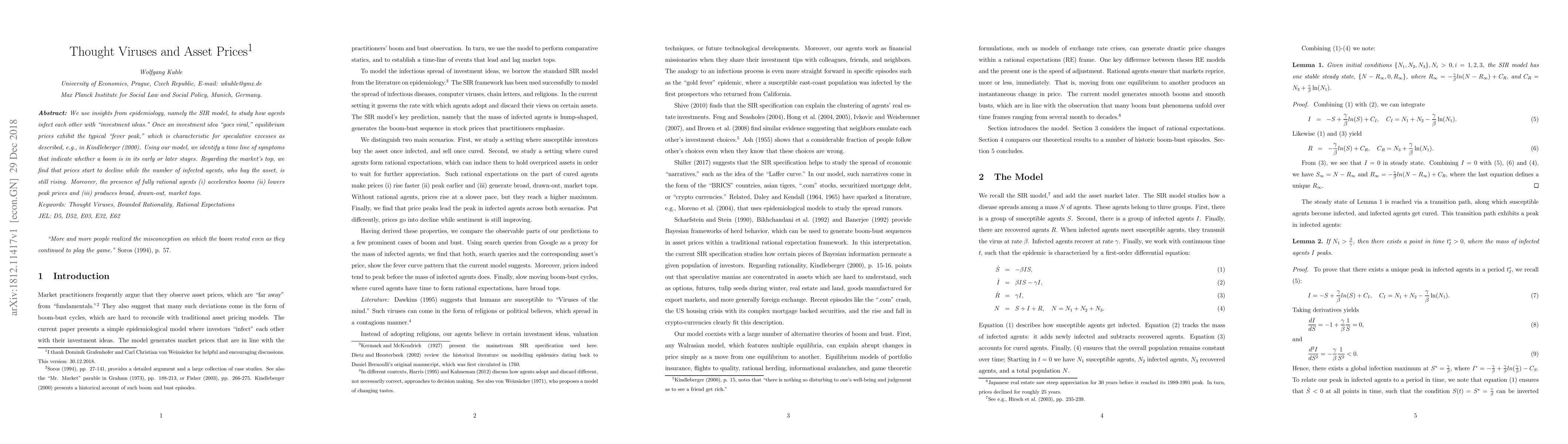 We use insights from epidemiology, namely the SIR model, to study how agents infect each other with "investment ideas." Once an investment idea "goes viral," equilibrium prices exhibit the typical "fever peak," which is characteristic for speculative excesses. Using our model, we identify a time line of symptoms that indicate whether a boom is in its early or later stages. Regarding the market's top, we find that prices start to decline while the number of infected agents, who buy the asset, is still rising. Moreover, the presence of fully rational agents (i) accelerates booms (ii) lowers peak prices and (iii) produces broad, drawn-out, market tops.