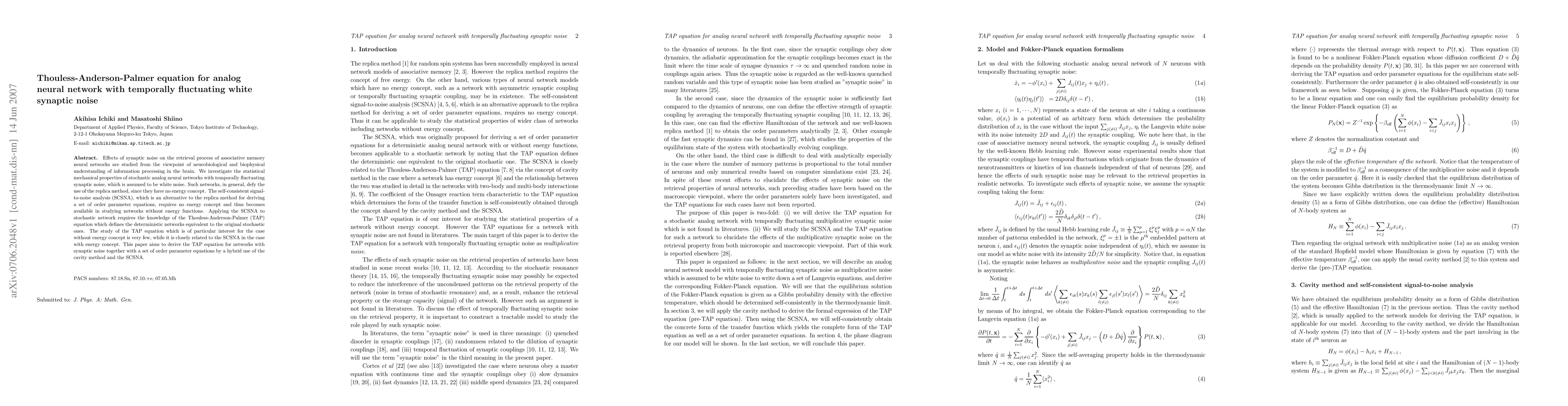 This paper derives the Thouless-Anderson-Palmer (TAP) equation for stochastic analog neural networks with temporally fluctuating white synaptic noise, employing a hybrid approach combining the cavity method and self-consistent signal-to-noise analysis (SCSNA) to study the effects of noise on associative memory retrieval. The TAP equation is crucial for understanding the statistical mechanical properties of networks without an energy concept.