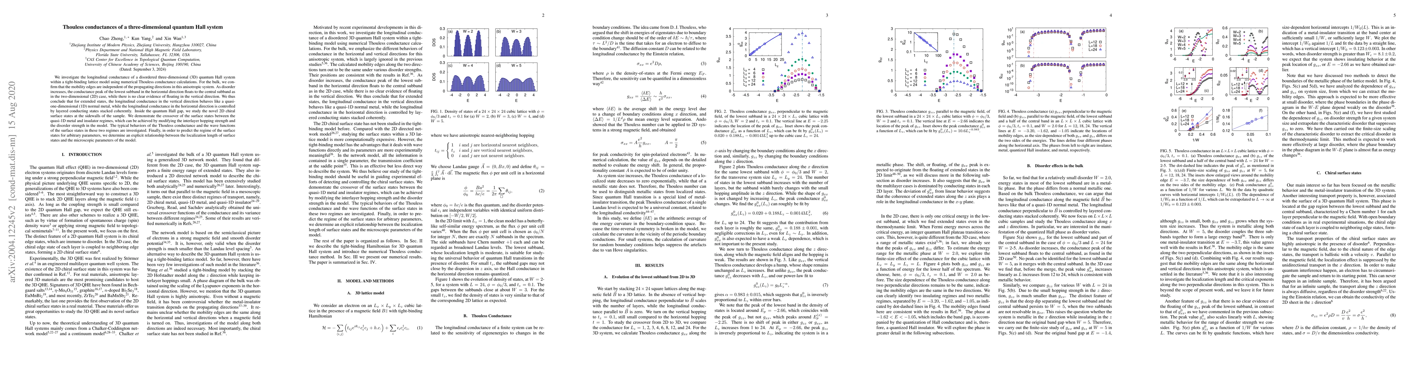 We investigate the longitudinal conductance of a disordered three-dimensional (3D) quantum Hall system within a tight-binding lattice model using numerical Thouless conductance calculations. For the bulk, we confirm that the mobility edges are independent of the propagating directions in this anisotropic system. As disorder increases, the conductance peak of the lowest subband in the horizontal direction floats to the central subband as in the two-dimensional (2D) case, while there is no clear evidence of floating in the vertical direction. We thus conclude that for extended states, the longitudinal conductance in the vertical direction behaves like a quasi-one-dimensional (1D) normal metal, while the longitudinal conductance in the horizontal direction is controlled by layered conducting states stacked coherently. Inside the quantum Hall gap, we study the novel 2D chiral surface states at the sidewalls of the sample. We demonstrate the crossover of the surface states between the quasi-1D metal and insulator regimes, which can be achieved by modifying the interlayer hopping strength and the disorder strength in the model. The typical behaviors of the Thouless conductance and the wave functions of the surface states in these two regimes are investigated. Finally, in order to predict the regime of the surface states for arbitrary parameters, we determine an explicit relationship between the localization length of surface states and the microscopic parameters of the model.