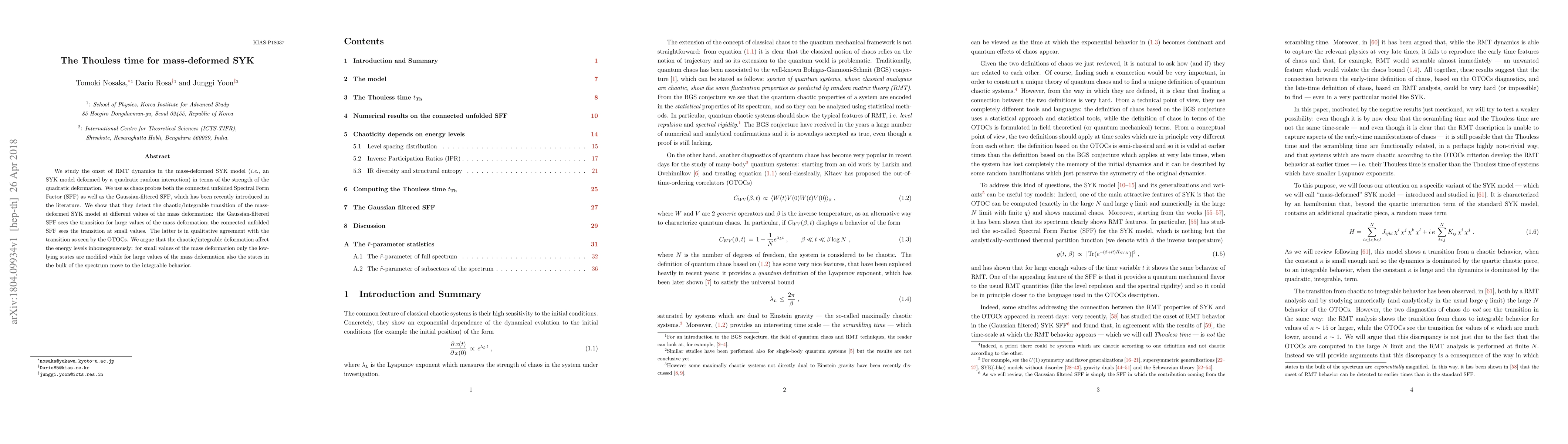 We study the onset of RMT dynamics in the mass-deformed SYK model (i.e. an SYK model deformed by a quadratic random interaction) in terms of the strength of the quadratic deformation. We use as chaos probes both the connected unfolded Spectral Form Factor (SFF) as well as the Gaussian-filtered SFF, which has been recently introduced in the literature. We show that they detect the chaotic/integrable transition of the mass-deformed SYK model at different values of the mass deformation: the Gaussian-filtered SFF sees the transition for large values of the mass deformation; the connected unfolded SFF sees the transition at small values. The latter is in qualitative agreement with the transition as seen by the OTOCs. We argue that the chaotic/integrable deformation affect the energy levels inhomogeneously: for small values of the mass deformation only the low-lying states are modified while for large values of the mass deformation also the states in the bulk of the spectrum move to the integrable behavior.
