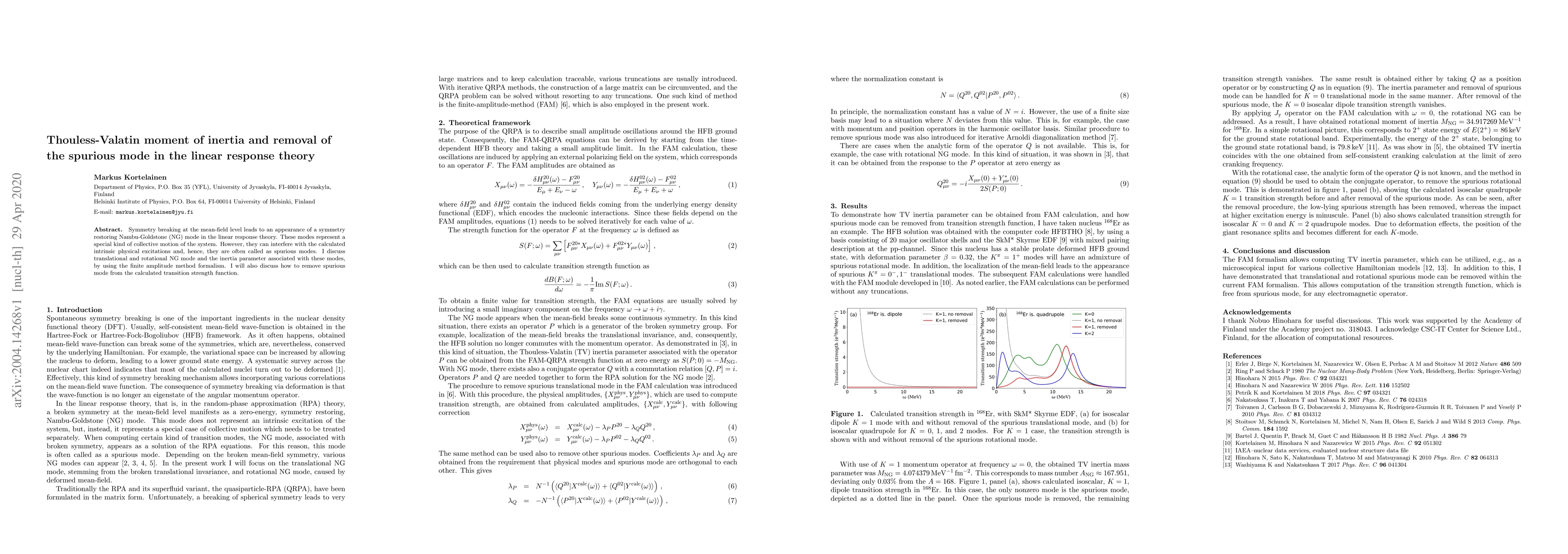 This paper discusses the Thouless-Valatin moment of inertia in the context of linear response theory, focusing on the removal of spurious Nambu-Goldstone modes that arise from symmetry breaking at the mean-field level. It employs the finite amplitude method to address these modes and proposes a method to eliminate them from the transition strength function.