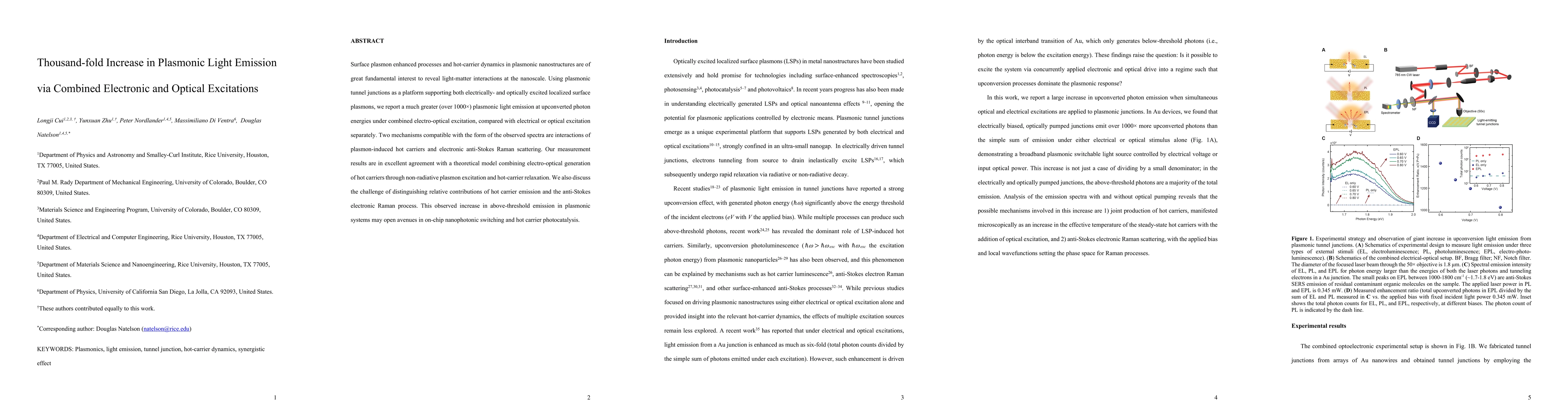 This paper reports a significant (over 1000x) enhancement in plasmonic light emission via combined electronic and optical excitations in plasmonic tunnel junctions, attributing the effect to hot carrier interactions and electronic anti-Stokes Raman scattering. The findings suggest potential applications in nanophotonic switching and photocatalysis.