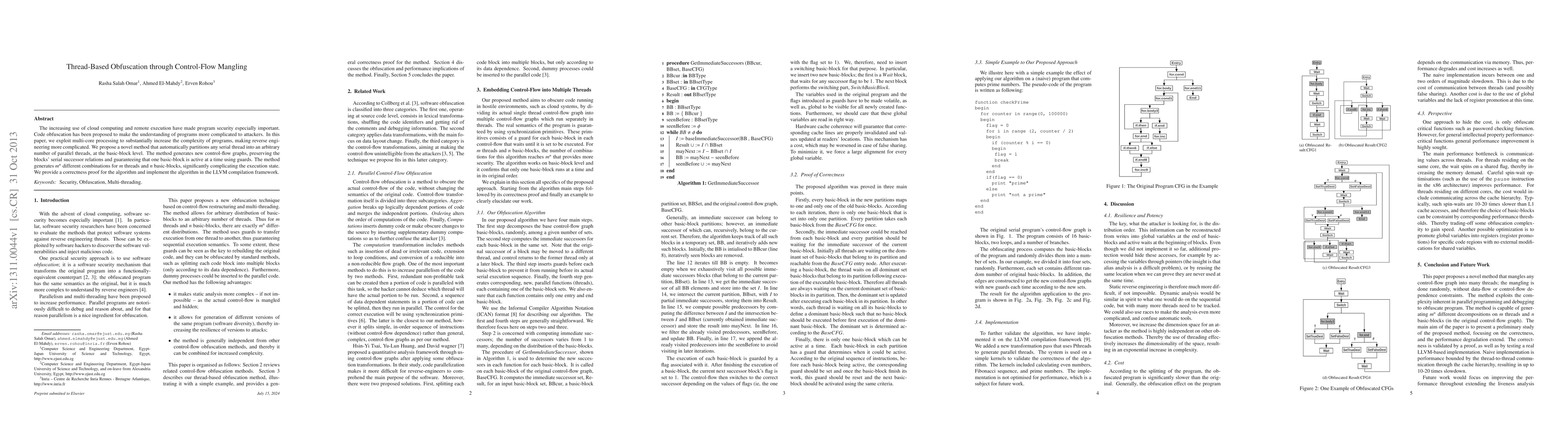 The paper presents a thread-based obfuscation technique through control-flow mangling, exploiting multi-core processing to complicate program understanding for attackers.