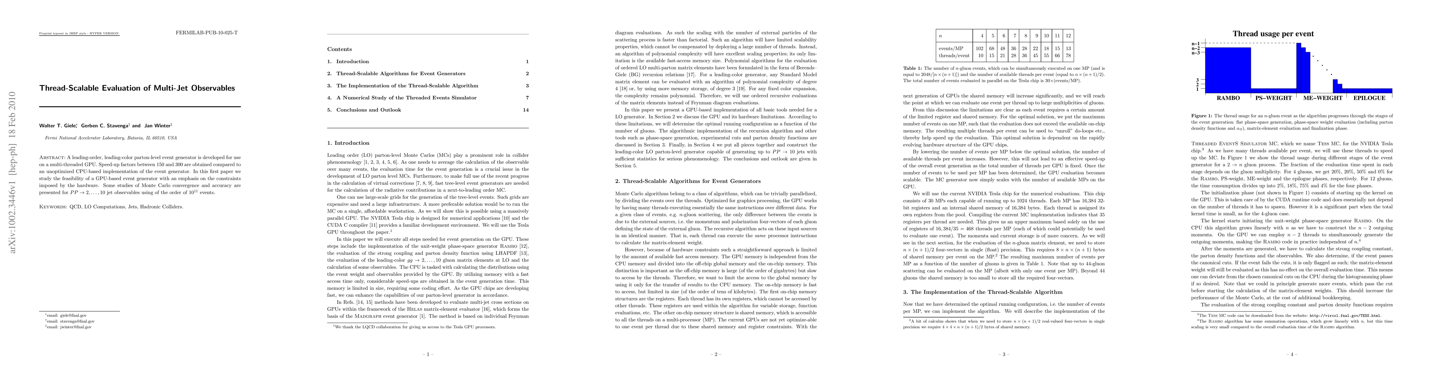 A leading-order, leading-color parton-level event generator is developed for use on a multi-threaded GPU. Speed-up factors between 150 and 300 are obtained compared to an unoptimized CPU-based implementation of the event generator. In this first paper we study the feasibility of a GPU-based event generator with an emphasis on the constraints imposed by the hardware. Some studies of Monte Carlo convergence and accuracy are presented for PP -> 2,...,10 jet observables using of the order of 1e11 events.