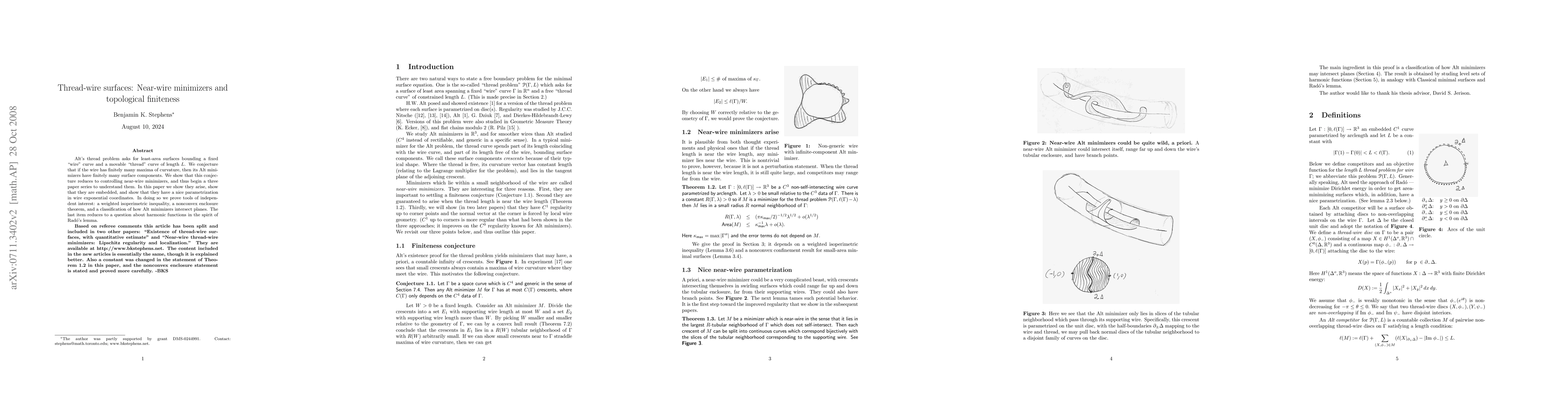 (NOTE: per referee comments, this article has been split; it is now superseded by "Existence of thread-wire minimizers" and "Near-wire thread-wire minimizers"; please see http://www.bkstephens.net.) Alt's thread problem asks for least-area surfaces bounding a fixed "wire" curve and a movable "thread" curve of length L. We conjecture that if the wire has finitely many maxima of curvature, then its Alt minimizers have finitely many surface components. We show that this conjecture reduces to controlling near-wire minimizers, and thus begin a three paper series to understand them. In this paper we show they arise, show that they are embedded, and show that they have a nice parametrization in wire exponential coordinates. In doing so we prove tools of independent interest: a weighted isoperimetric inequality, a nonconvex enclosure theorem, and a classification of how Alt minimizers intersect planes. The last item reduces to a question about harmonic functions in the spirit of Rado's lemma.