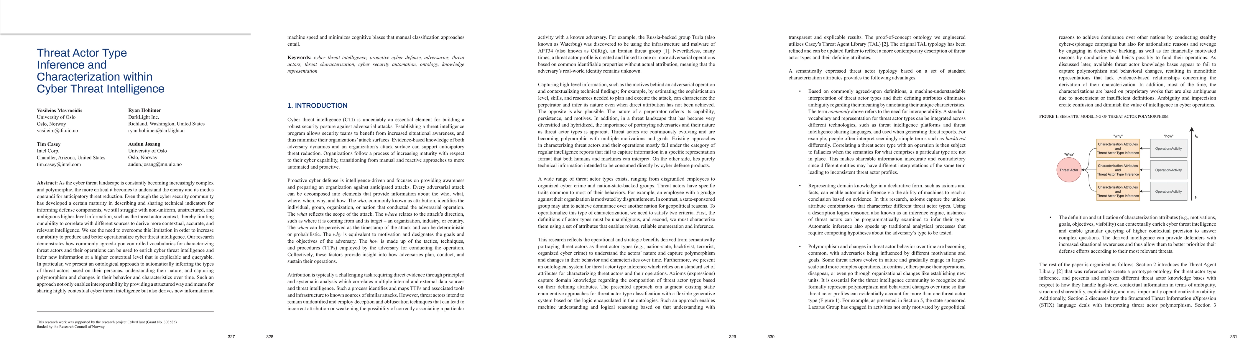 As the cyber threat landscape is constantly becoming increasingly complex and polymorphic, the more critical it becomes to understand the enemy and its modus operandi for anticipatory threat reduction. Even though the cyber security community has developed a certain maturity in describing and sharing technical indicators for informing defense components, we still struggle with non-uniform, unstructured, and ambiguous higher-level information, such as the threat actor context, thereby limiting our ability to correlate with different sources to derive more contextual, accurate, and relevant intelligence. We see the need to overcome this limitation in order to increase our ability to produce and better operationalize cyber threat intelligence. Our research demonstrates how commonly agreed upon controlled vocabularies for characterizing threat actors and their operations can be used to enrich cyber threat intelligence and infer new information at a higher contextual level that is explicable and queryable. In particular, we present an ontological approach to automatically inferring the types of threat actors based on their personas, understanding their nature, and capturing polymorphism and changes in their behavior and characteristics over time. Such an approach not only enables interoperability by providing a structured way and means for sharing highly contextual cyber threat intelligence but also derives new information at machine speed and minimizes cognitive biases that manual classification approaches entail.