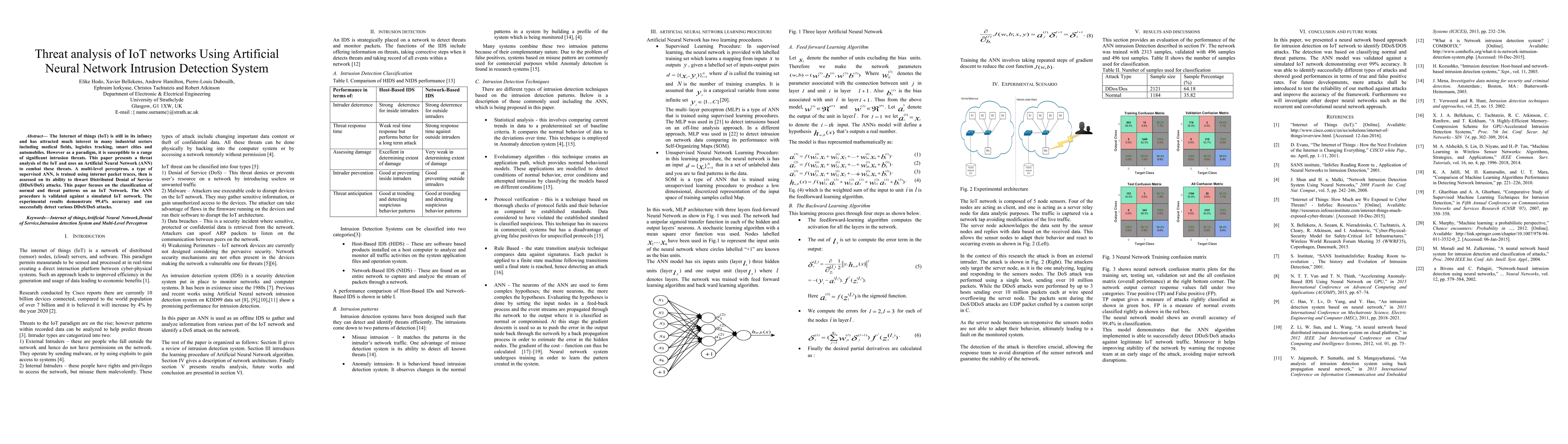 The Internet of things (IoT) is still in its infancy and has attracted much interest in many industrial sectors including medical fields, logistics tracking, smart cities and automobiles. However as a paradigm, it is susceptible to a range of significant intrusion threats. This paper presents a threat analysis of the IoT and uses an Artificial Neural Network (ANN) to combat these threats. A multi-level perceptron, a type of supervised ANN, is trained using internet packet traces, then is assessed on its ability to thwart Distributed Denial of Service (DDoS/DoS) attacks. This paper focuses on the classification of normal and threat patterns on an IoT Network. The ANN procedure is validated against a simulated IoT network. The experimental results demonstrate 99.4% accuracy and can successfully detect various DDoS/DoS attacks.