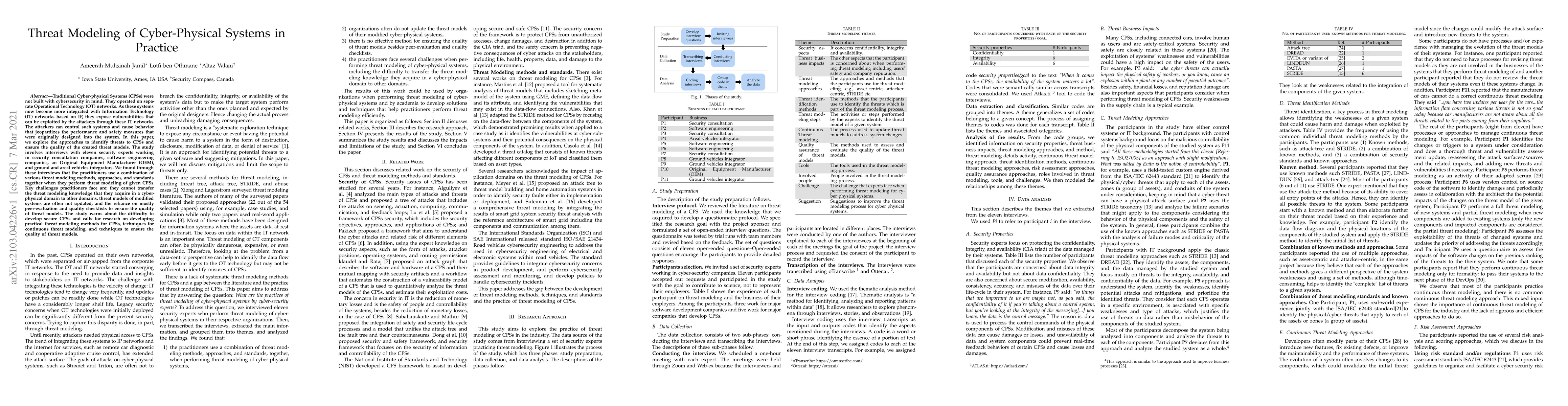 Traditional Cyber-physical Systems(CPSs) were not built with cybersecurity in mind. They operated on separate Operational Technology (OT) networks. As these systems now become more integrated with Information Technology (IT) networks based on IP, they expose vulnerabilities that can be exploited by the attackers through these IT networks. The attackers can control such systems and cause behavior that jeopardizes the performance and safety measures that were originally designed into the system. In this paper, we explore the approaches to identify threats to CPSs and ensure the quality of the created threat models. The study involves interviews with eleven security experts working in security consultation companies, software engineering companies, an Original Equipment Manufacturer (OEM),and ground and areal vehicles integrators. We found through these interviews that the practitioners use a combination of various threat modeling methods, approaches, and standards together when they perform threat modeling of given CPSs. key challenges practitioners face are: they cannot transfer the threat modeling knowledge that they acquire in a cyber-physical domain to other domains, threat models of modified systems are often not updated, and the reliance on mostly peer-evaluation and quality checklists to ensure the quality of threat models. The study warns about the difficulty to develop secure CPSs and calls for research on developing practical threat modeling methods for CPSs, techniques for continuous threat modeling, and techniques to ensure the quality of threat models.