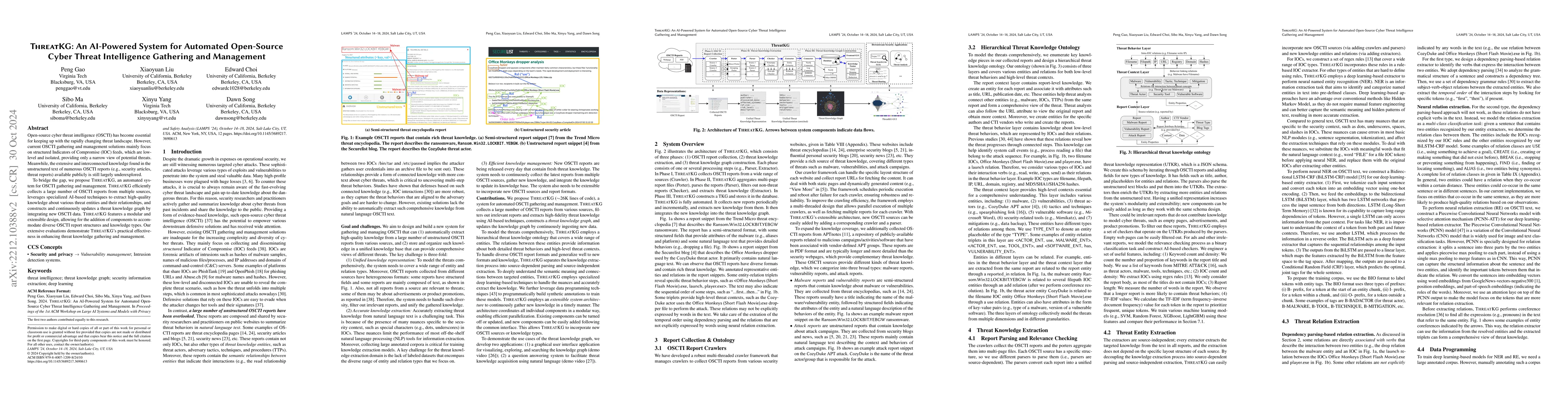 ThreatKG automates the collection and management of open-source cyber threat intelligence by constructing a knowledge graph from unstructured reports, utilizing a hierarchical ontology, a deep learning-based extraction pipeline, and a scalable system architecture. Evaluations show its effectiveness in enhancing cyber threat knowledge gathering.