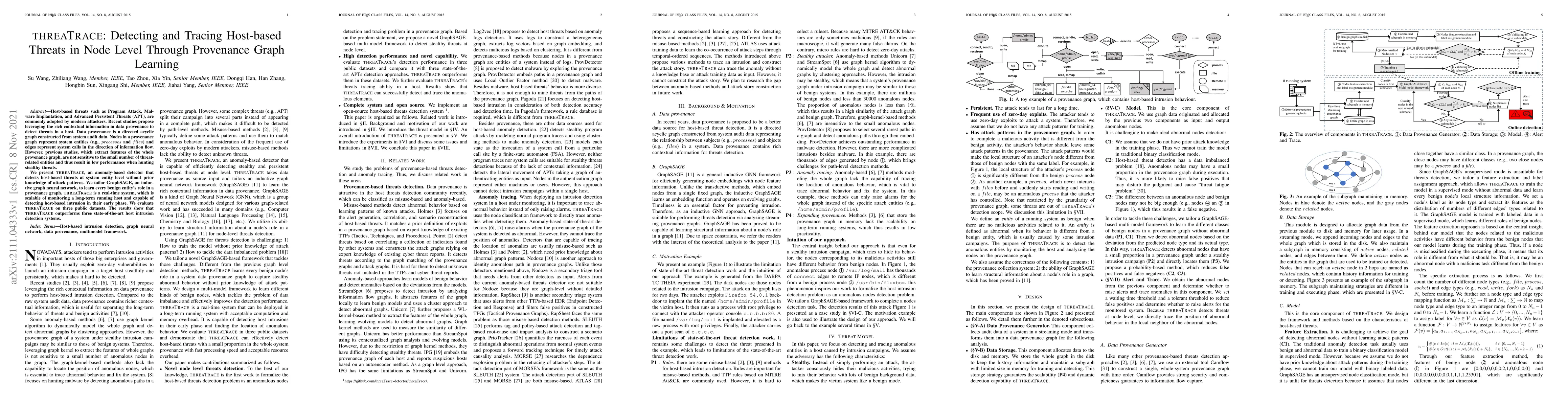 threaTrace is an anomaly-based detector that leverages GraphSAGE to detect host-based threats at the system entity level without prior knowledge of attack patterns. It outperforms state-of-the-art systems by learning the role of benign entities in a data provenance graph, enabling early detection of stealthy intrusions.