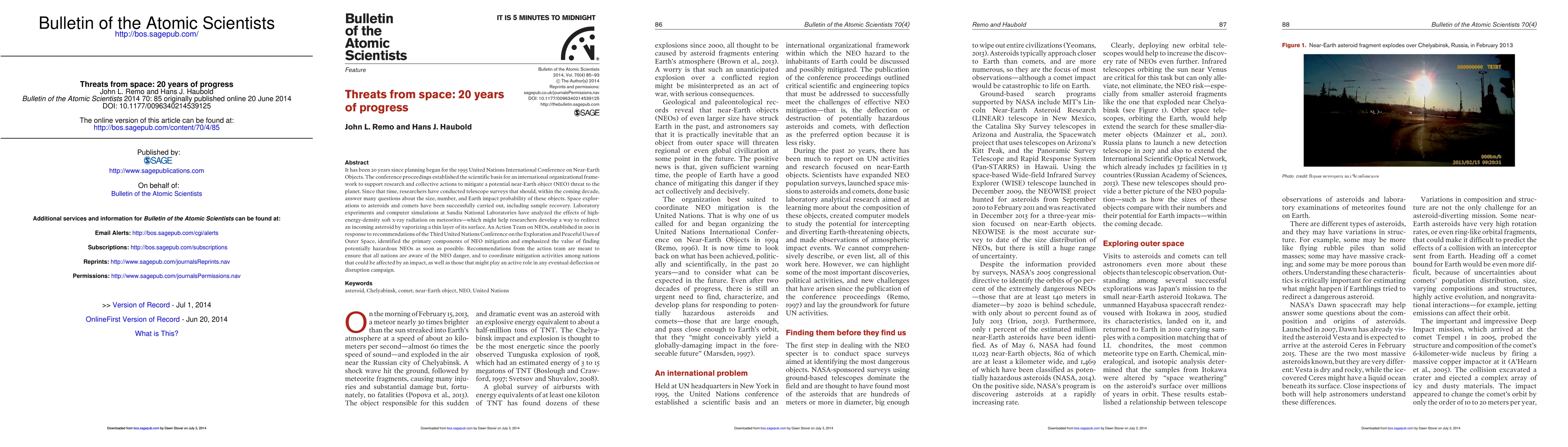 It has been 20 years since planning began for the 1995 United Nations International Conference on Near-Earth Objects. The conference proceedings established the scientific basis for an international organizational framework to support research and collective actions to mitigate a potential near-Earth object (NEO) threat to the planet. Since that time, researchers have conducted telescope surveys that should, within the coming decade, answer many questions about the size, number, and Earth impact probability of these objects. Space explorations to asteroids and comets have been successfully carried out, including sample recovery. Laboratory experiments and computer simulations at Sandia National Laboratories have analyzed the effects of soft X-ray radiation on meteorites - which might help researchers develop a way to redirect an incoming asteroid by vaporizing a thin layer of its surface. An Action Team on NEOs, established in 2001 in response to recommendations of the Third United Nations Conference on the Exploration and Peaceful Uses of Outer Space, identified the primary components of NEO mitigation and emphasized the value of finding potentially hazardous NEOs as soon as possible. Recommendations from the Action Team are meant to ensure that all nations are aware of the NEO danger; and to coordinate mitigation activities among nations that could be affected by an impact, as well as those that might play an active role in any eventual deflection or disruption campaign.