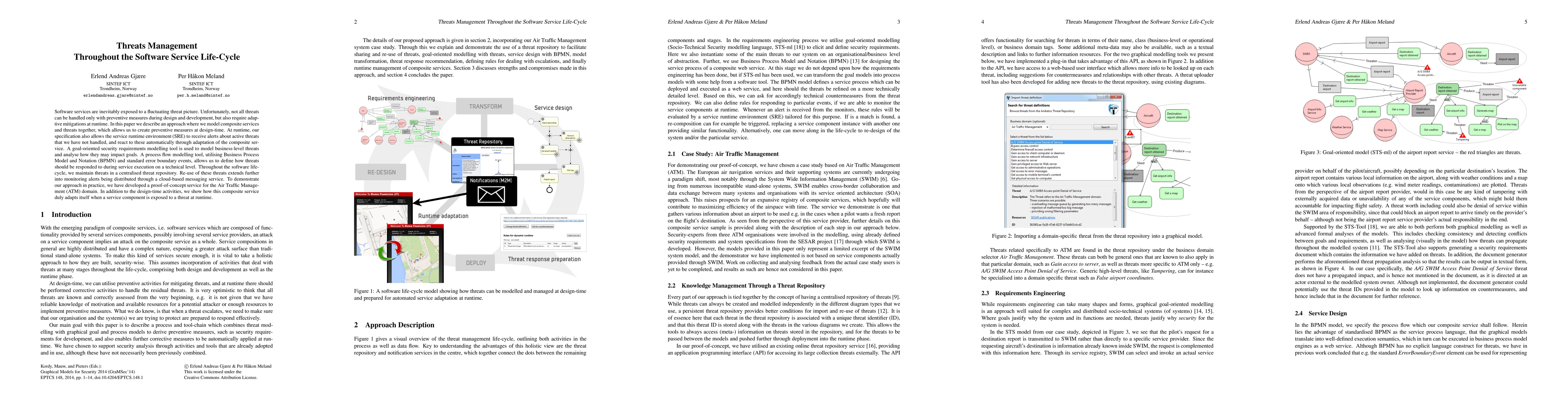 This paper proposes an approach to manage threats throughout the software service life-cycle by modeling composite services and threats together, enabling preventive measures at design-time and adaptive mitigations at runtime. A centralized threat repository and a cloud-based messaging service facilitate monitoring and alert distribution, demonstrated through a proof-of-concept service in the Air Traffic Management domain.