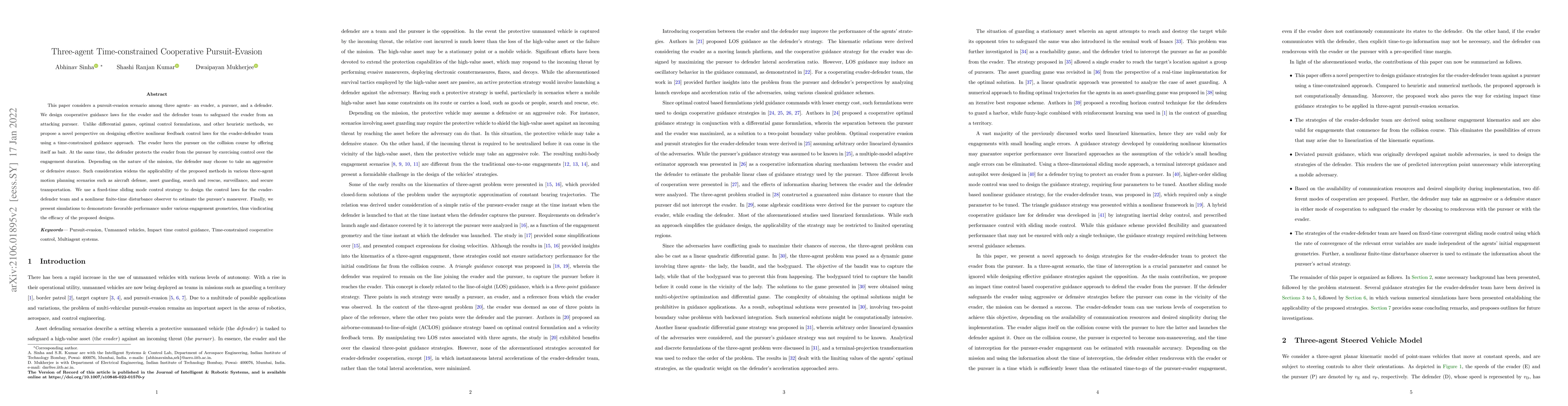 Researchers design a cooperative pursuit-evasion strategy for three agents using time-constrained guidance laws to protect an evader from a pursuer, with applications in various motion planning scenarios.