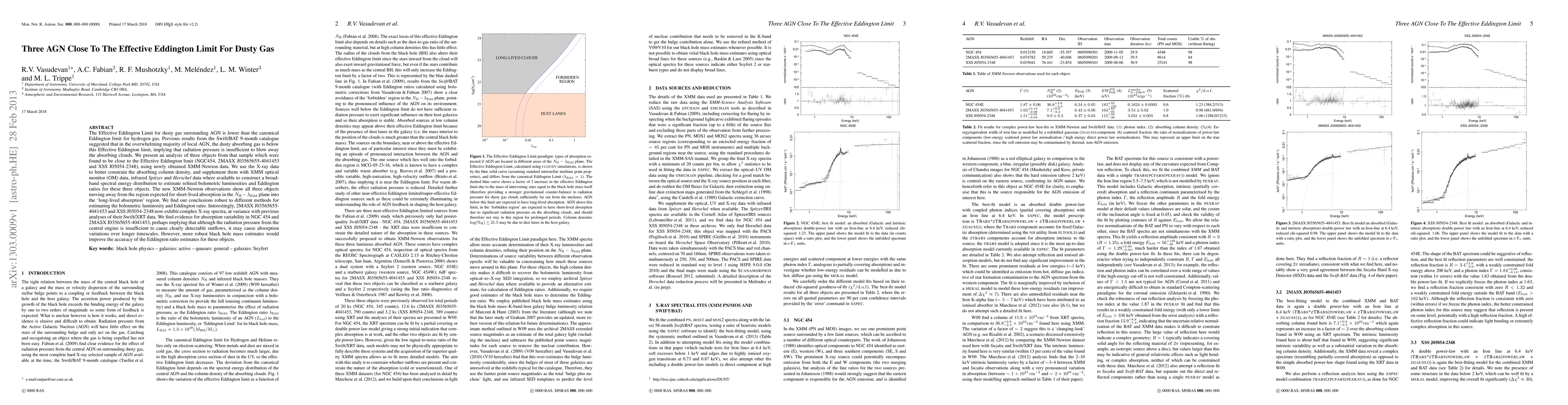 The Effective Eddington Limit for dusty gas surrounding AGN is lower than the canonical Eddington limit for hydrogen gas. Previous results from the Swift/BAT 9-month catalogue suggested that in the overwhelming majority of local AGN, the dusty absorbing gas is below this Effective Eddington limit, implying that radiation pressure is insufficient to blow away the absorbing clouds. We present an analysis of three objects from that sample which were found to be close to the Effective Eddington limit (NGC454, 2MASX J03565655-4041453 and XSS J05054-2348), using newly obtained XMM-Newton data. We use the X-ray data to better constrain the absorbing column density, and supplement them with XMM optical monitor (OM) data, infrared Spitzer and Herschel data where available to construct a broad-band spectral energy distribution to estimate refined bolometric luminosities and Eddington ratios for these three objects. The new XMM-Newton observations show all three objects moving away from the region expected for short-lived absorption in the N_H-\lambda_{Edd} plane into the `long-lived absorption' region. We find our conclusions robust to different methods for estimating the bolometric luminosity and Eddington ratio. Interestingly, 2MASX J03565655-4041453 and XSS J05054-2348 now exhibit complex X-ray spectra, at variance with previous analyses of their Swift/XRT data. We find evidence for absorption variability in NGC 454 and 2MASX J03565655-4041453, perhaps implying that although the radiation pressure from the central engine is insufficient to cause clearly detectable outflows, it may cause absorption variations over longer timescales. However, more robust black hole mass estimates would improve the accuracy of the Eddington ratio estimates for these objects.