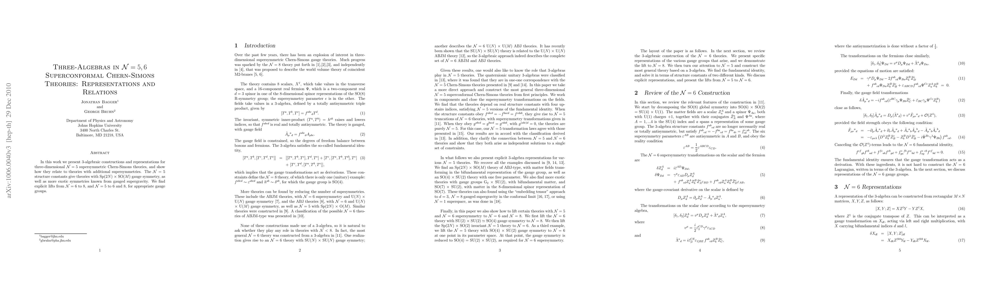 In this work we present 3-algebraic constructions and representations for three-dimensional N = 5 supersymmetric Chern-Simons theories, and show how they relate to theories with additional supersymmetries. The N = 5 structure constants give theories with Sp(2N) \times SO(M) gauge symmetry, as well as more exotic symmetries known from gauged supergravity. We find explicit lifts from N = 6 to 8, and N = 5 to 6 and 8, for appropriate gauge groups.