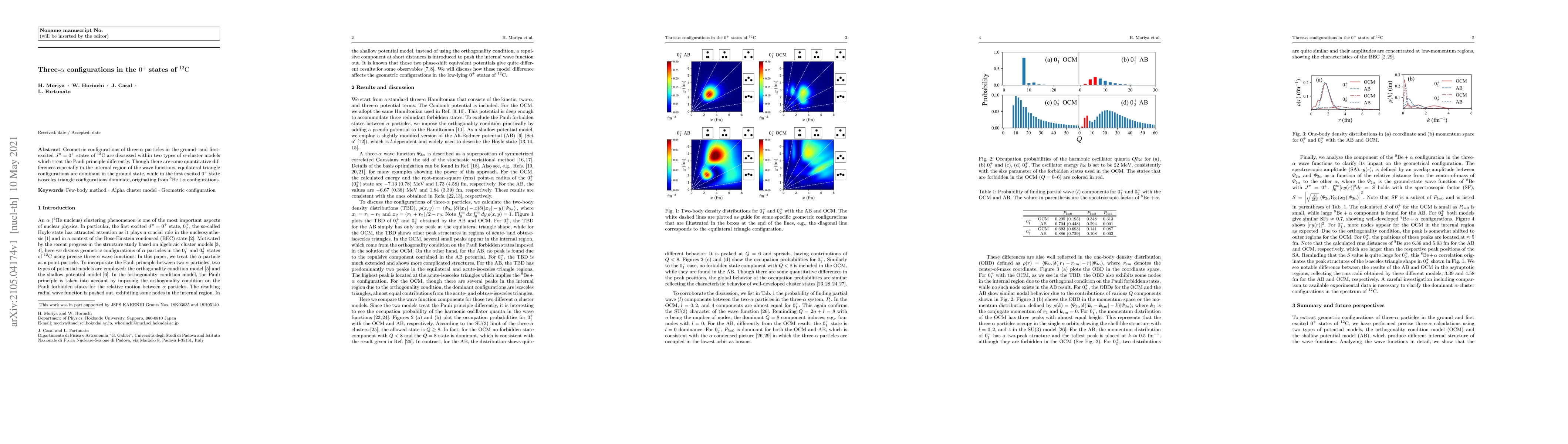 Researchers studied different geometric configurations of three-alpha particles in 12C using two models that treat the Pauli principle differently. Equilateral triangle configurations dominate the ground state, while isosceles triangles prevail in the first excited state.