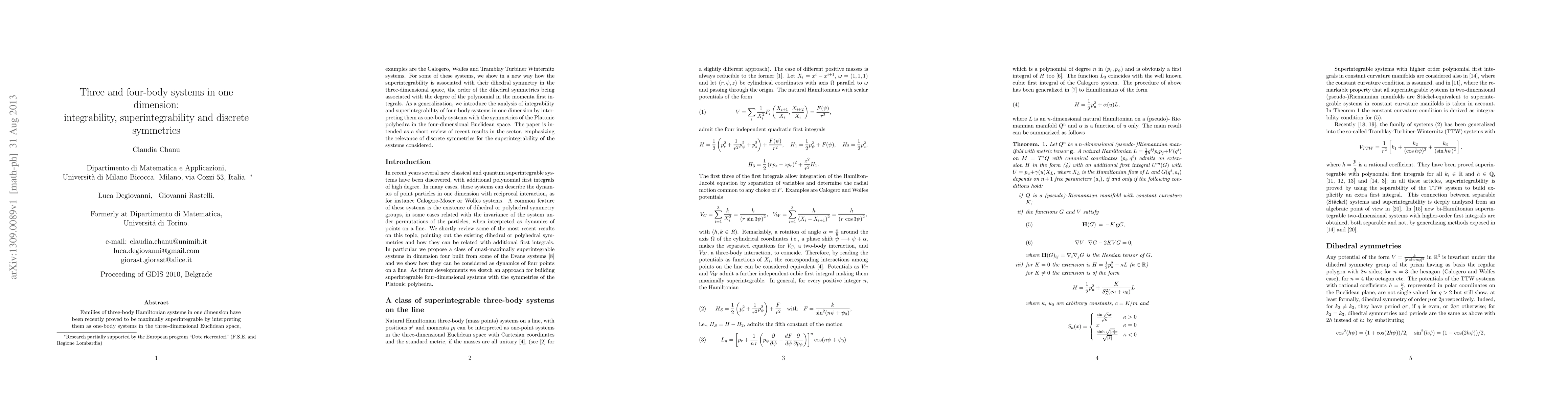 This paper reviews recent findings on the integrability and superintegrability of one-dimensional three-body systems, linking their maximal superintegrability to dihedral symmetries in three-dimensional space. It extends the analysis to four-body systems, interpreting them as one-body systems with symmetries of Platonic polyhedra in four-dimensional space, emphasizing the role of discrete symmetries.