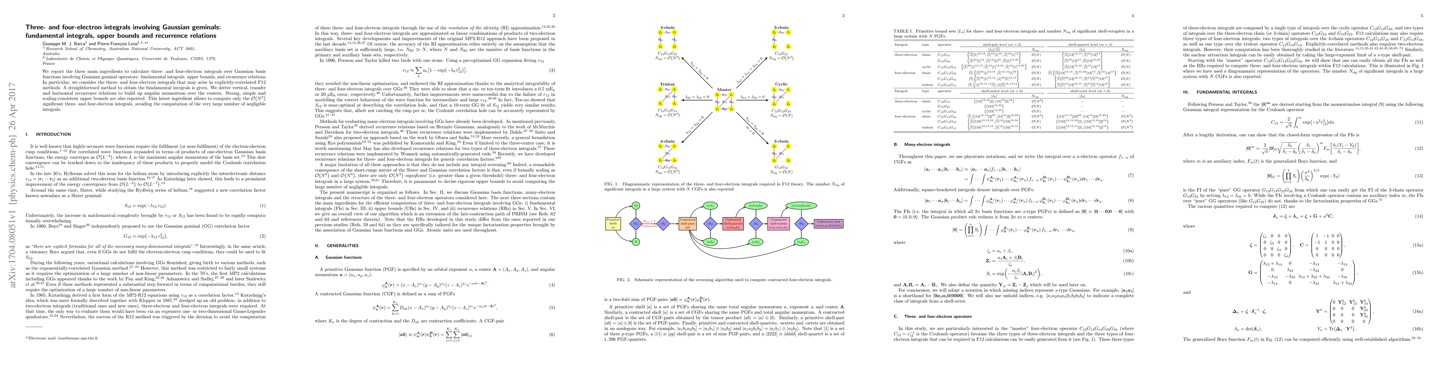 This paper presents methods to efficiently calculate three- and four-electron integrals using Gaussian geminals, including fundamental integrals, recurrence relations, and upper bounds to significantly reduce computational effort by focusing on significant integrals.